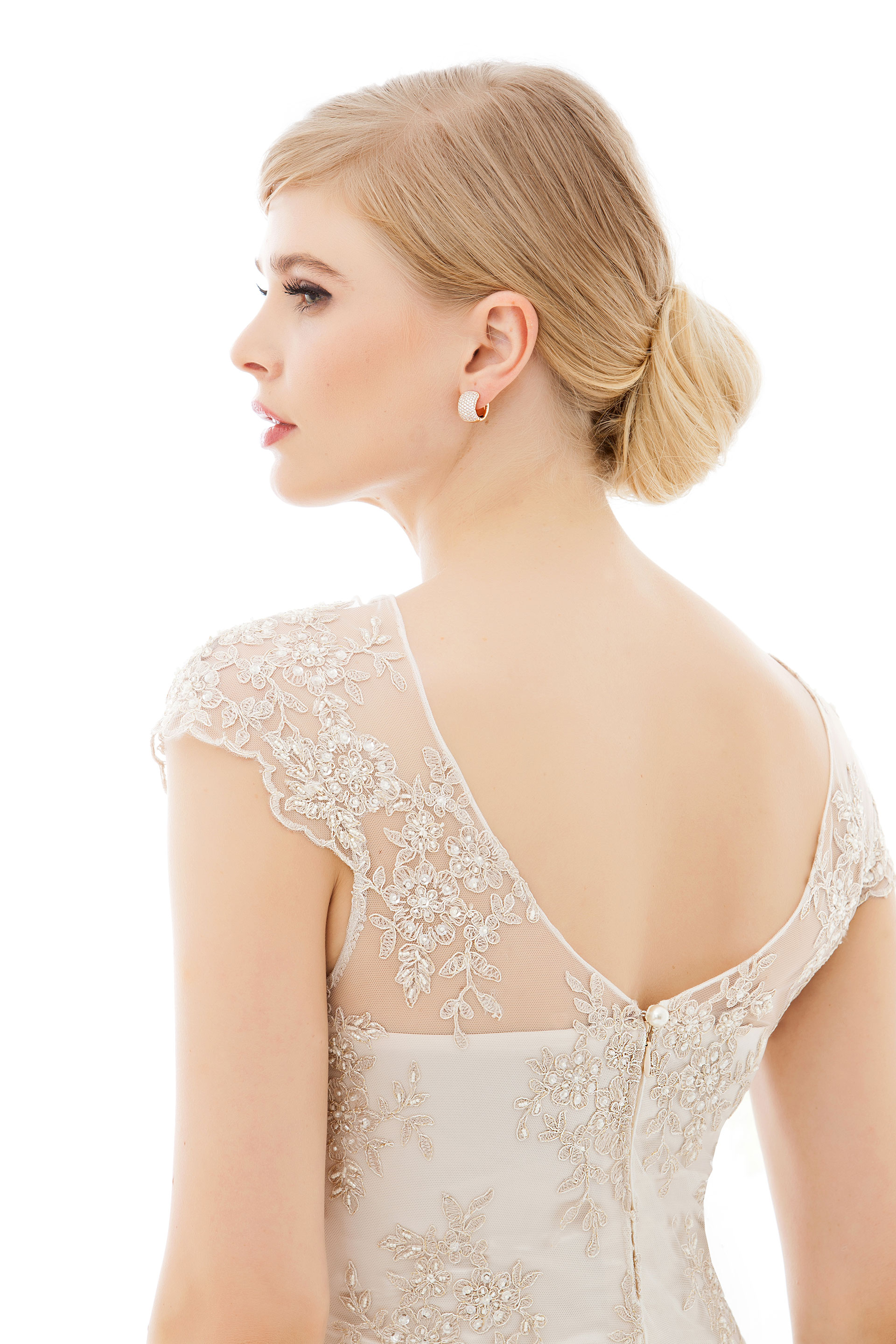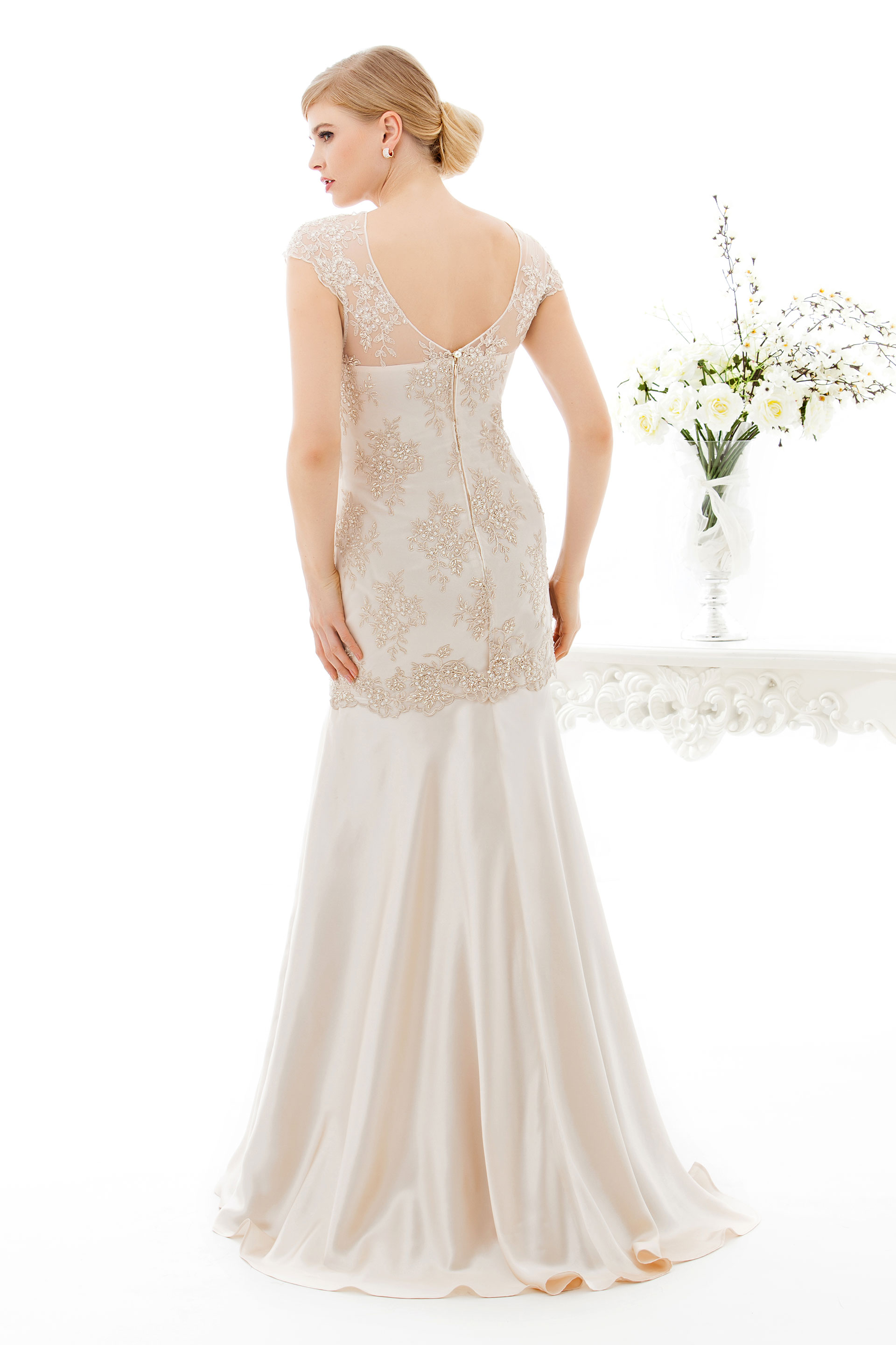Langes Abendkleid mit schwingendem, ausgestellten Rock aus edlem Seidensatin und einem Oberteil aus eleganter Perlenspitze mit angeschnittenen kurzen Ärmeln und V-Ausschnitt im Rücken.
