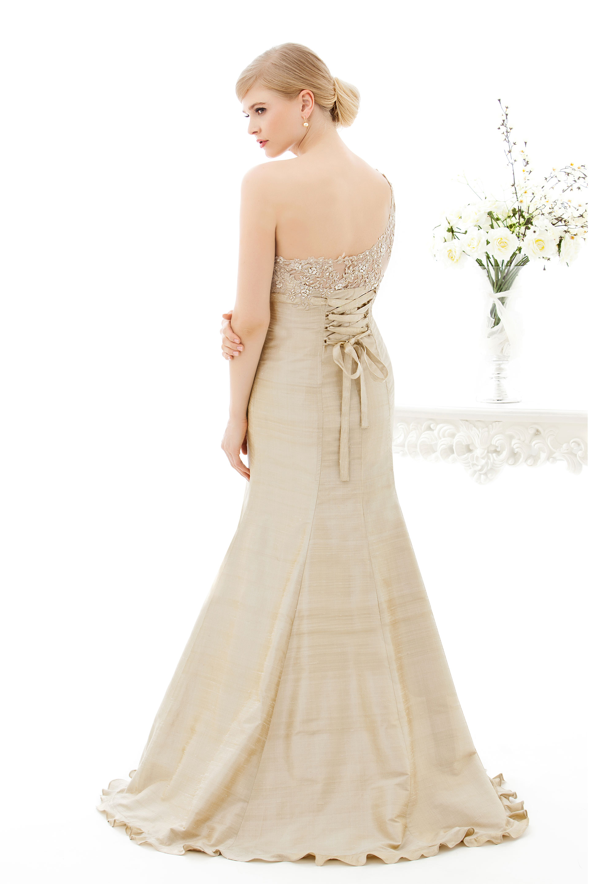 Abendkleid in Meerjungfrau-Silhouette. Handgefertigt aus edler Wildseide mit einem asymmetrischen Oberteil aus Perlenspitze mit handgenähten Applikationen.