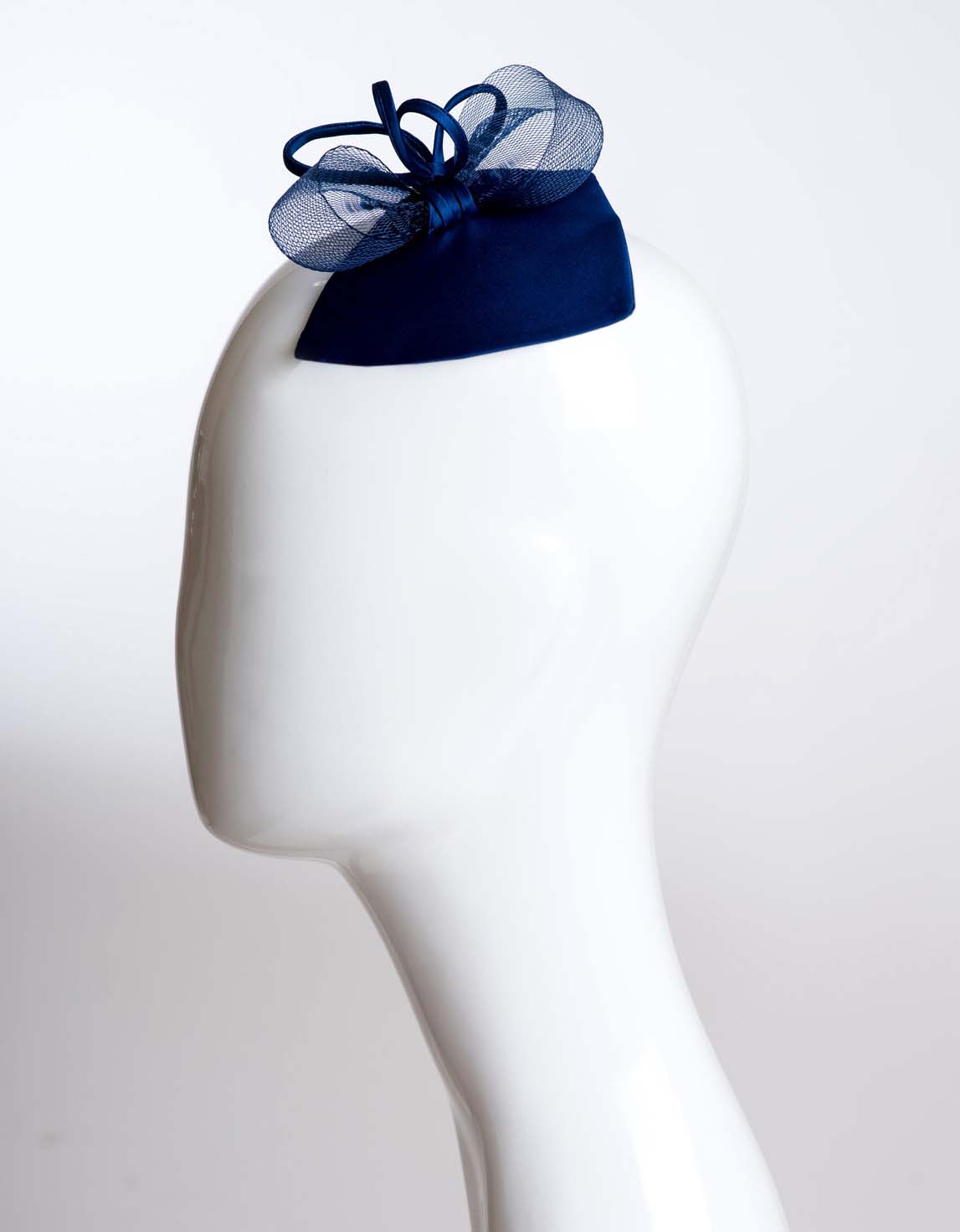Abendmode Hütchen aus wertvollem Seidensatin mit süßem Schleifendetail.