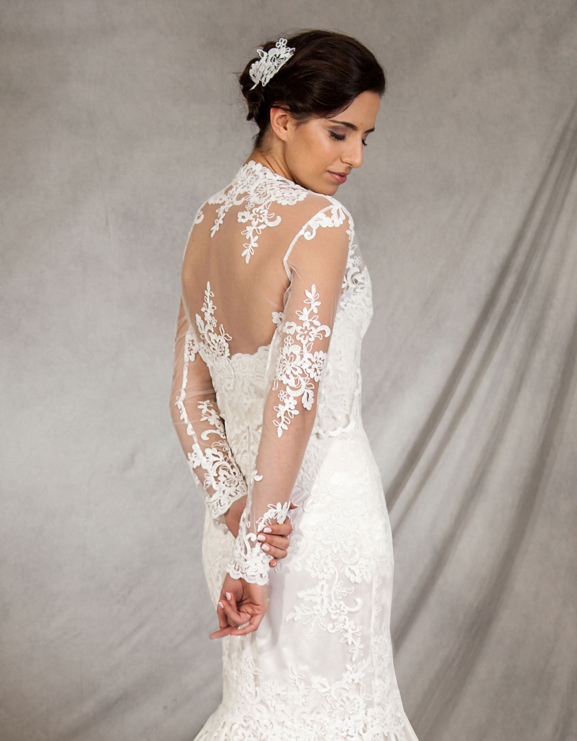 Wunderschöner taillenlanger handgefertigter Spitzenbolero mit langen Ärmeln aus Spitze mit Blumenmotiven.