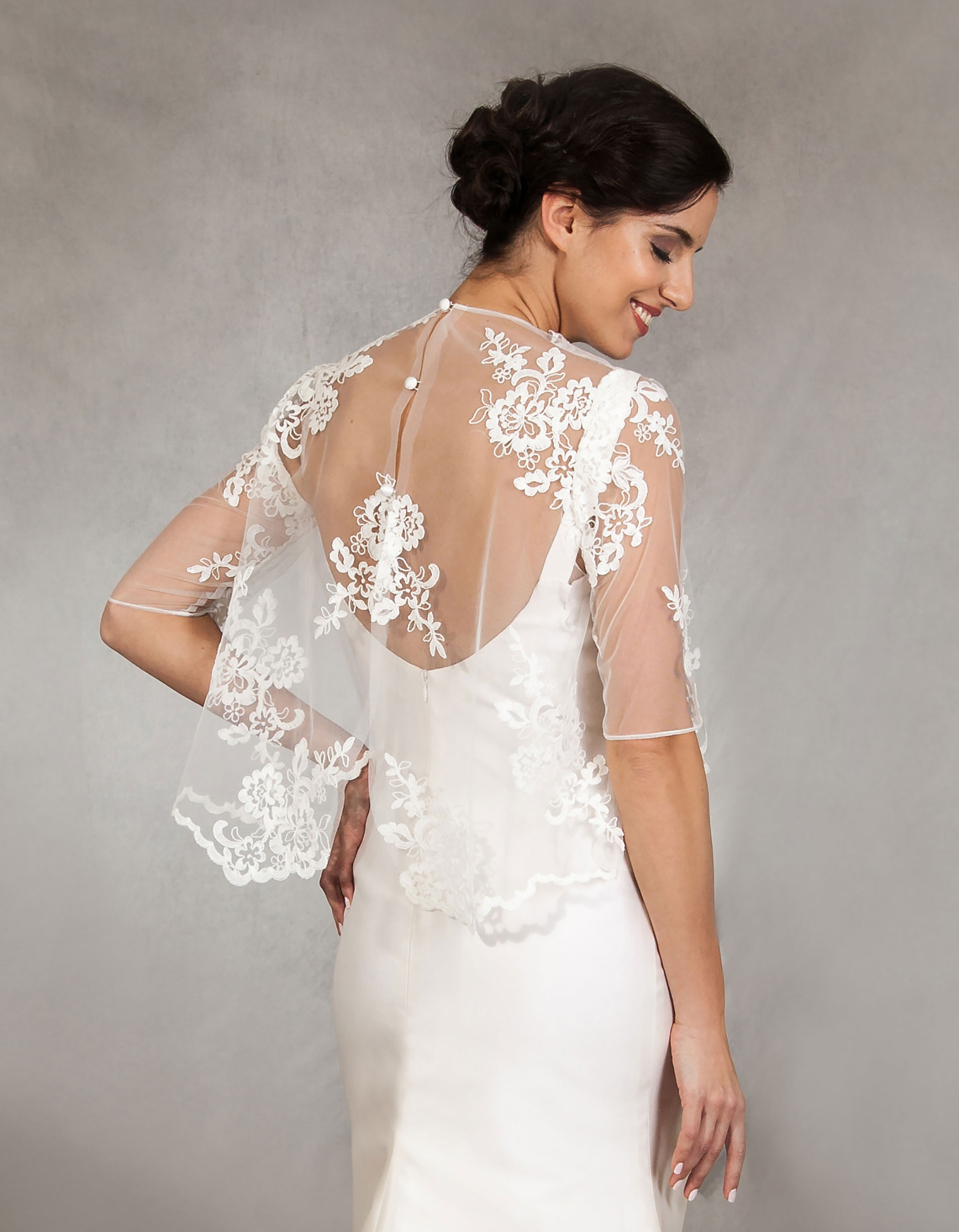 Elegant schwingender Spitzenbolero mit Dreiviertelärmeln und Verschluss im Rücken, der den Körper leicht umspielt.