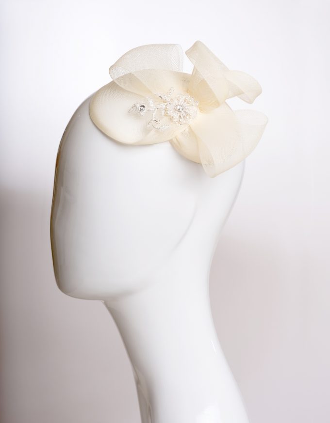 Brauthut mit Schleifendetails aus Spitze sowie feinen Applikationen aus hochwertiger Perlenspitze.