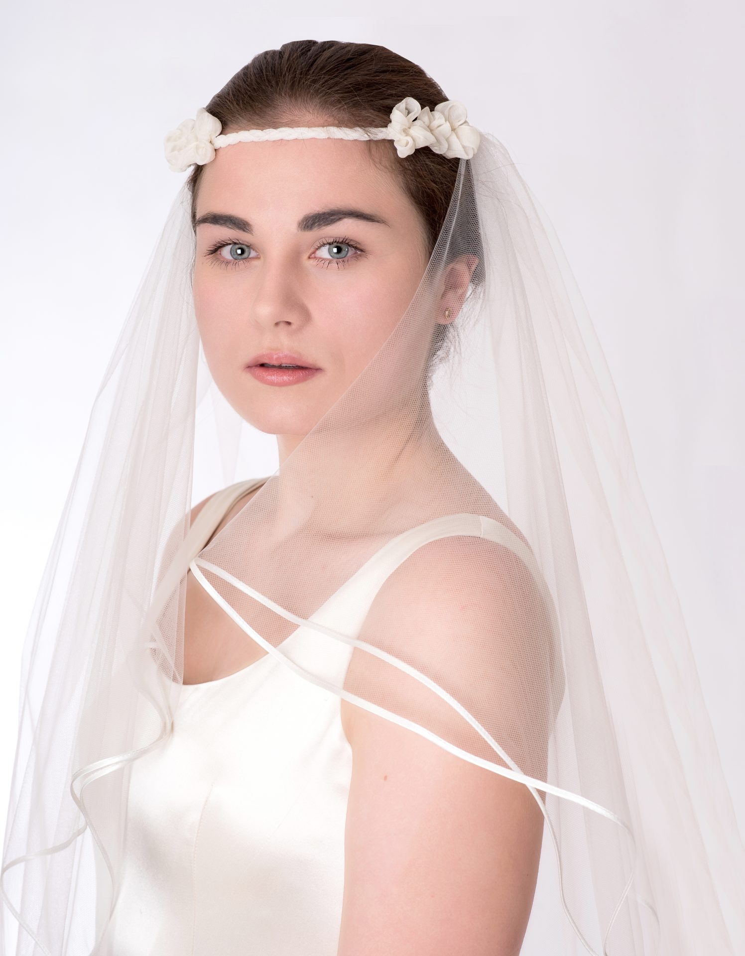 Wunderschöner Tüll-Schleier mit Satinbote im Stil der 20er Jahre. Befestigt wird der Brautschleier am Haarband mit exklusiven, handgefertigten Stoffblumen.