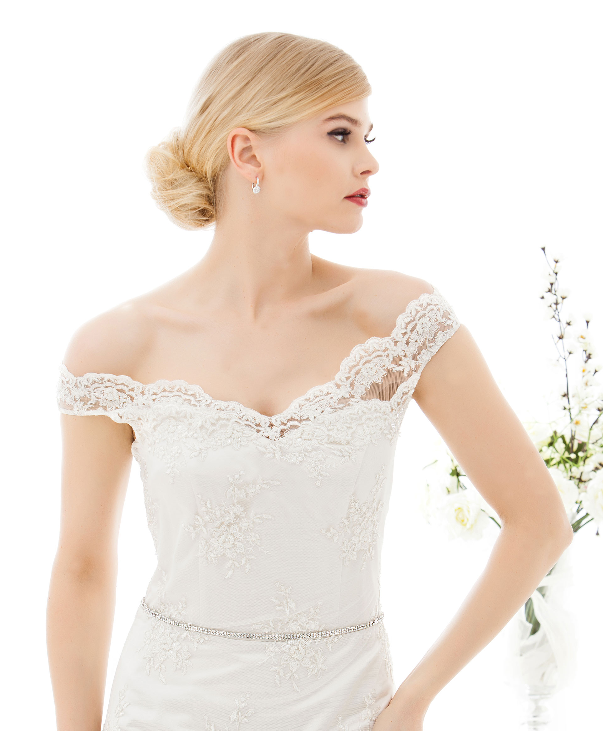 Verführerisches Oberteil aus exklusiver Perlenspitze mit Carmen-Ausschnitt.