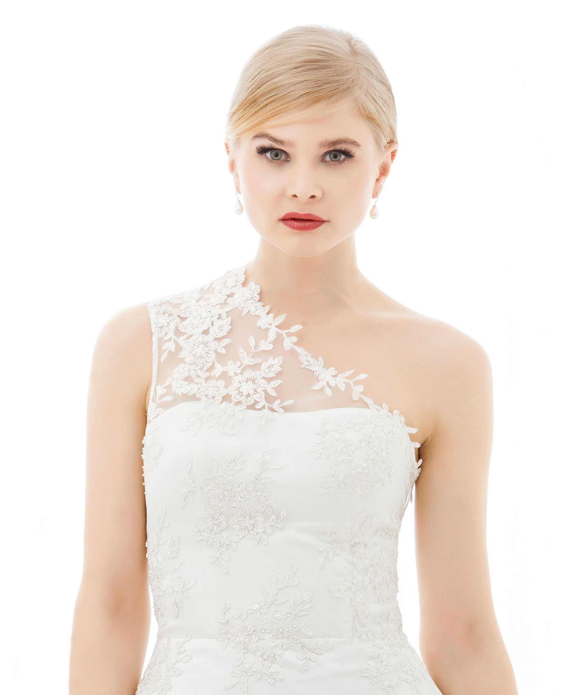 Asymmetrisches Spitzenoberteil komplett mit Perlen bestickt. Den Ausschnitt schmücken zarte Blattapplikationen.