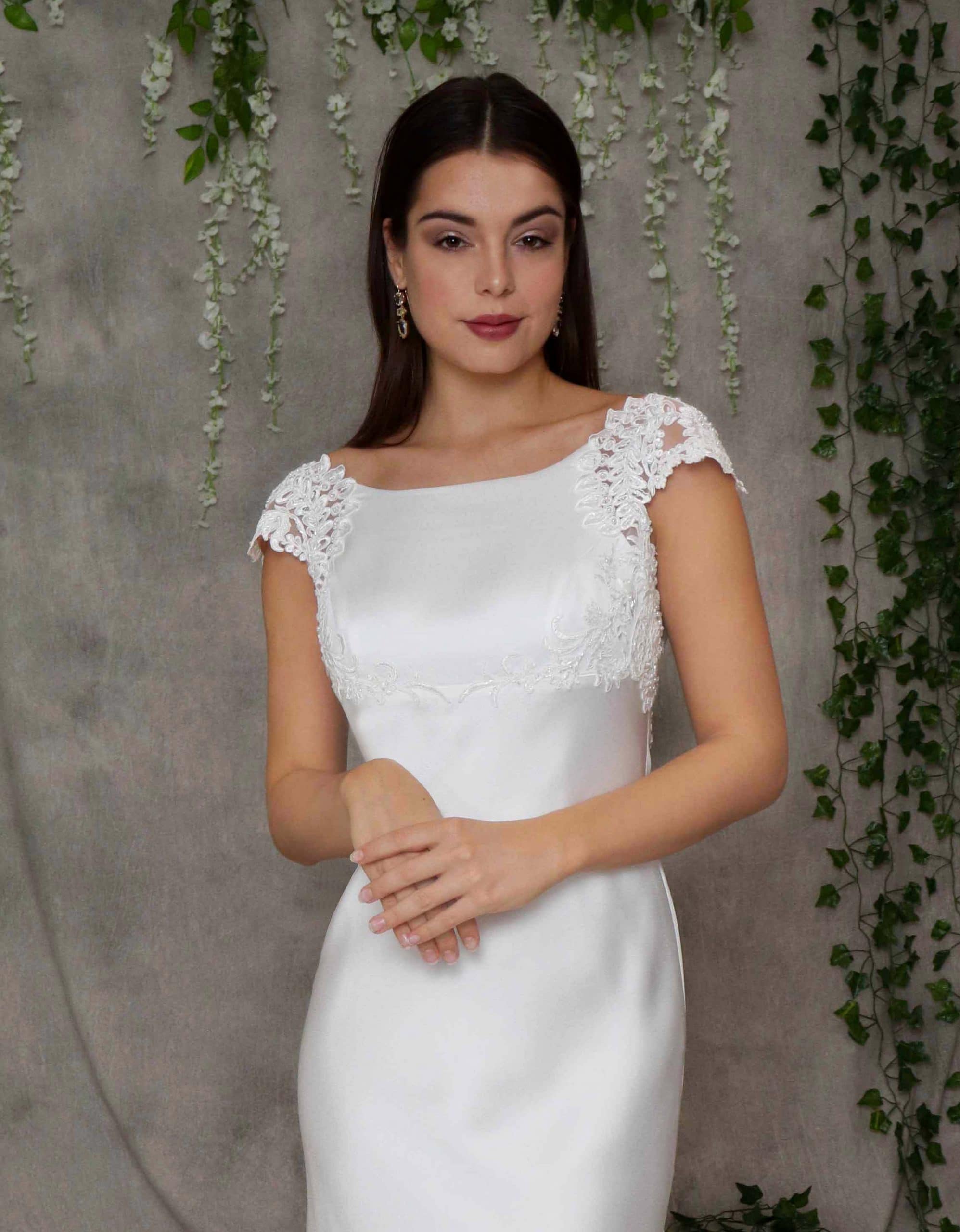 Majestätisches, schlichtes Brautkleid aus fließender Crêpe-Satin Seide im Meerjungfrauenstil mit aufregender, langer Schleppe. Das Oberteil mit Spitze und Cap-Ärmeln hat einen U-Boot Ausschnitt vorne und einen V-Rückenausschnitt mit aufwändig bestickter Spitze verziert. Die glitzernden Perlen und Pailletten auf der Spitze setzen Sie als Braut perfekt in Szene. Mit diesem Brautkleid ziehen Sie alle Blicke auf sich.