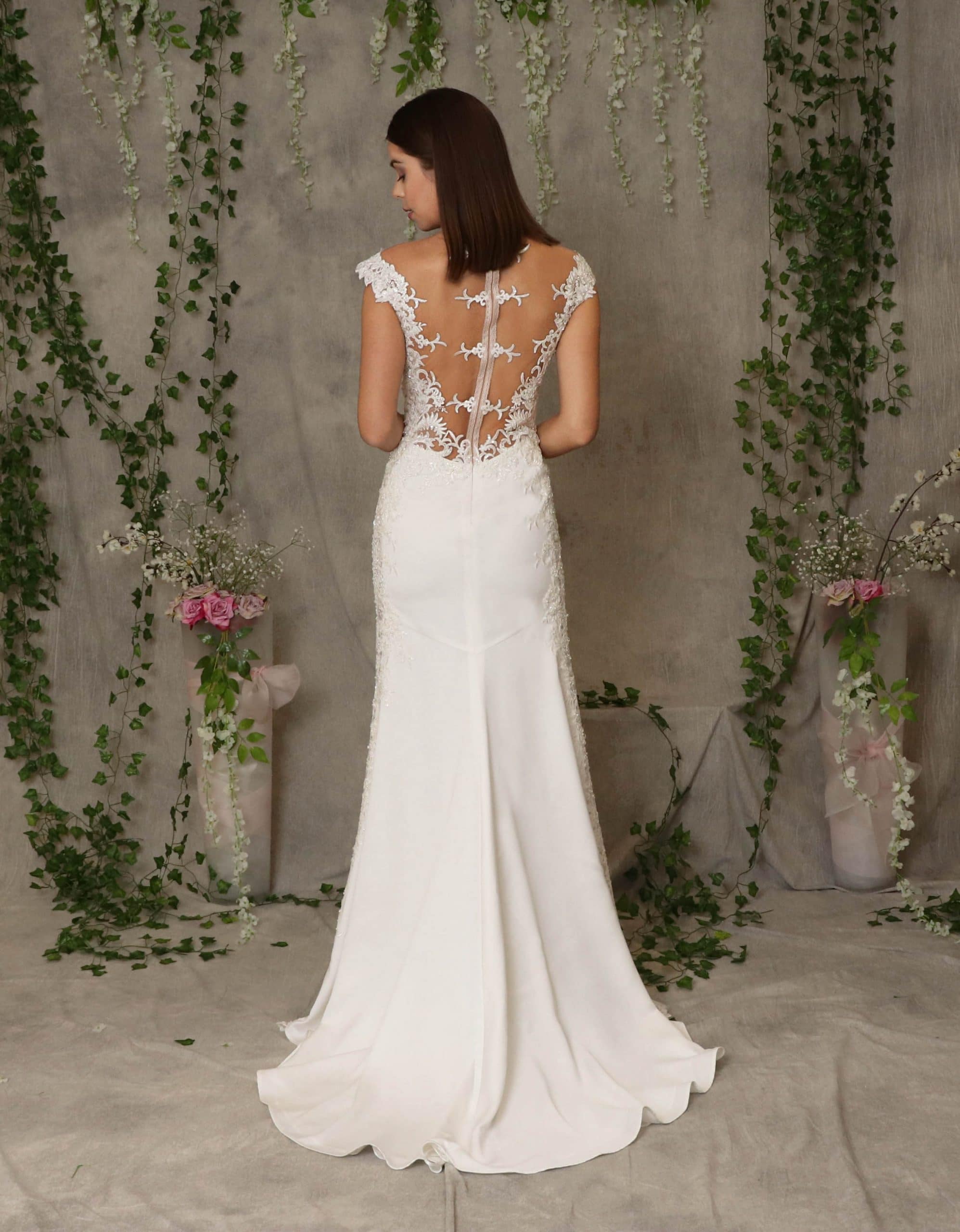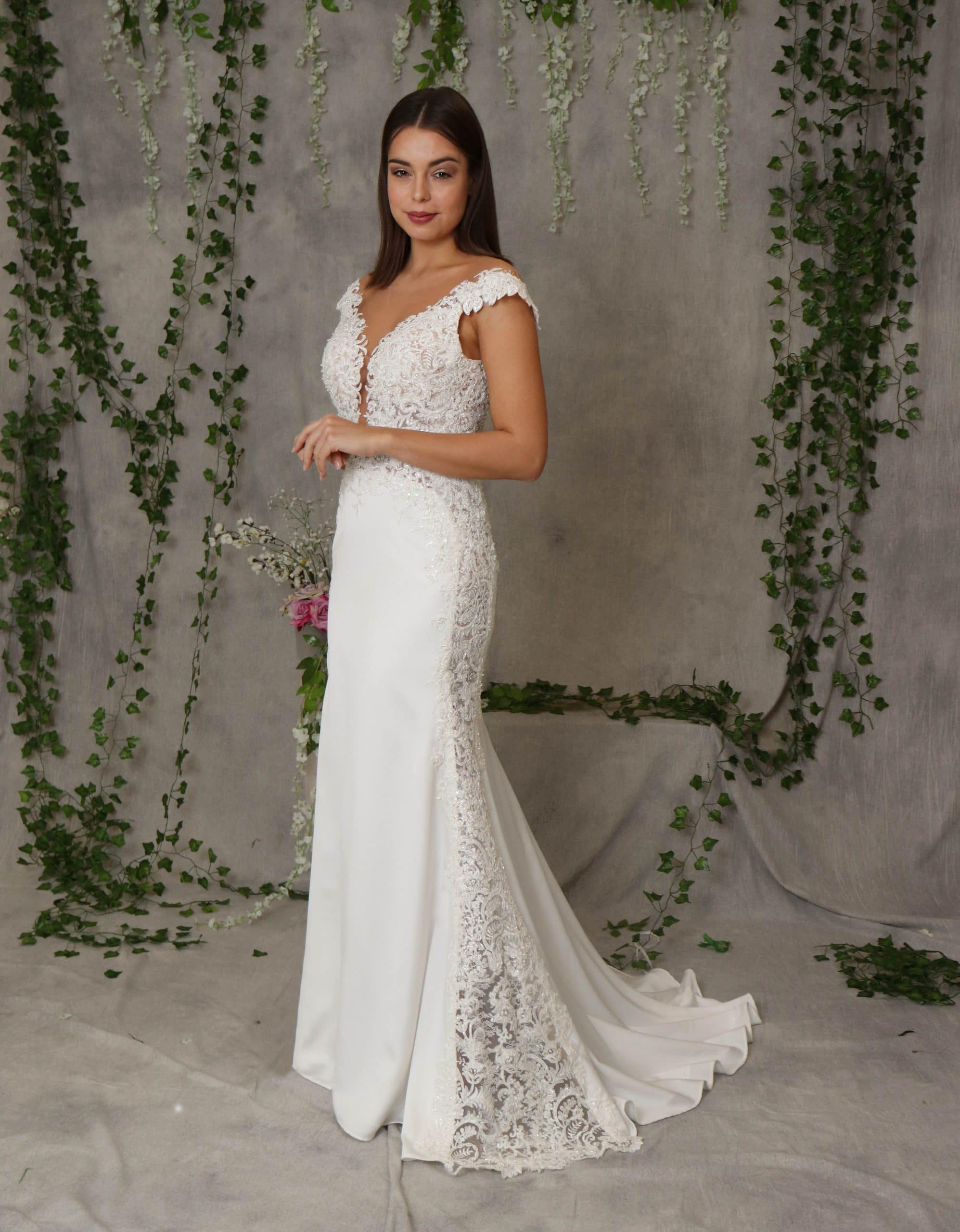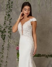 Sehr edles Brautkleid mit einem sanft fließenden Rock, der seitlich über und über von Hand mit Spitzenapplikationen bestickt wurde und durch eine elegante Schleppe komplettiert wird. Das Oberteil besteht ebenfalls aus aufwändig verarbeiteter Perlenspitze und setzt durch den tiefen Carmen Ausschnitt ihr Dekolleté perfekt in Szene. Doch auch der Rückenausschnitt bietet einen Wow-Effekt und ist ein weiteres Highlight dieses umwerfenden Modells.