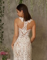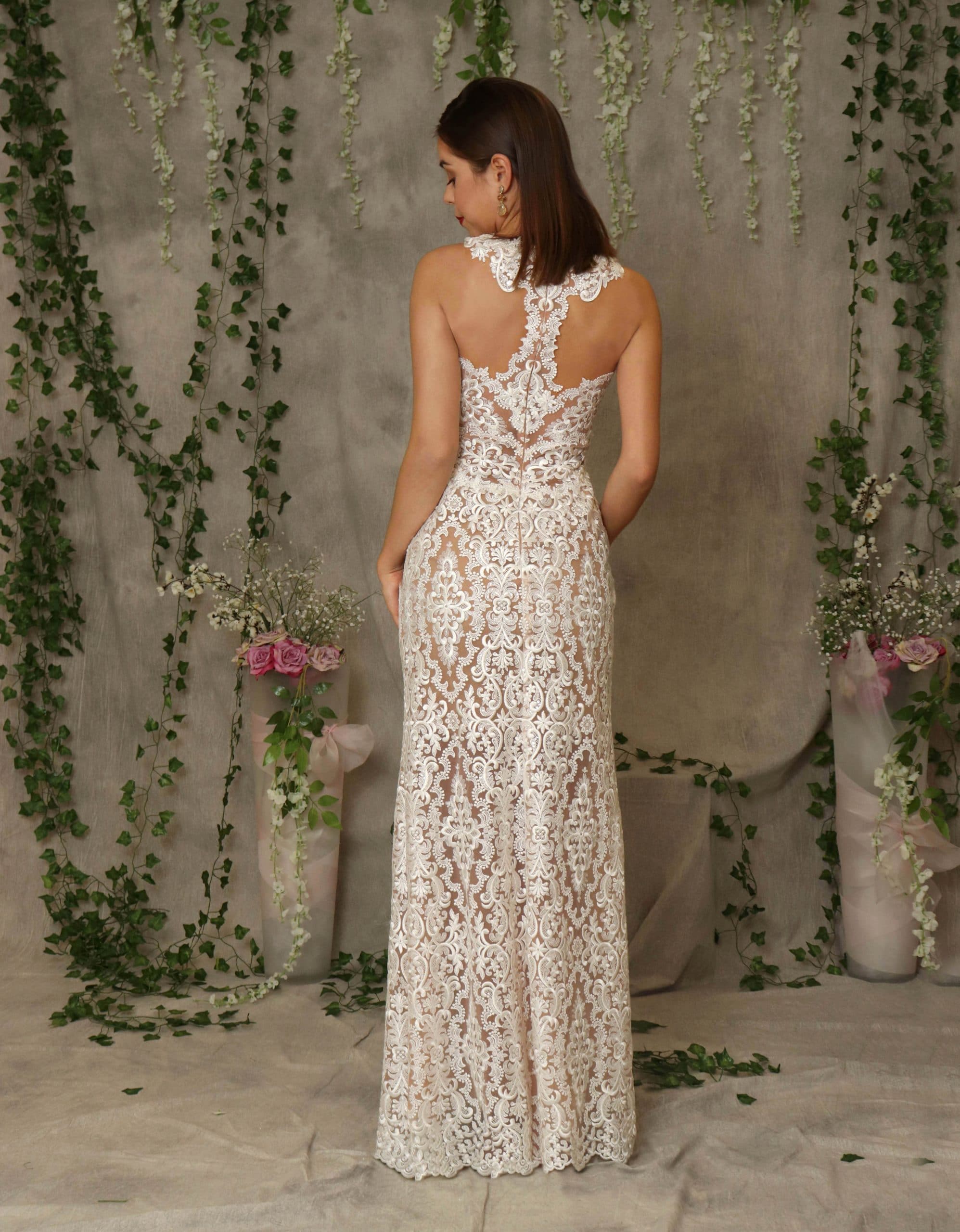 Modernes, langes Brautkleid aus edler Spitze. Die weißen Stickereien wirken wie auf den Körper gemalt. Highlight ist die außergewöhnliche Gestaltung des Rückens. Durch die geschickte Platzierung der Spitzenaplikationen wird die Taille perfekt in Szene gesetzt.