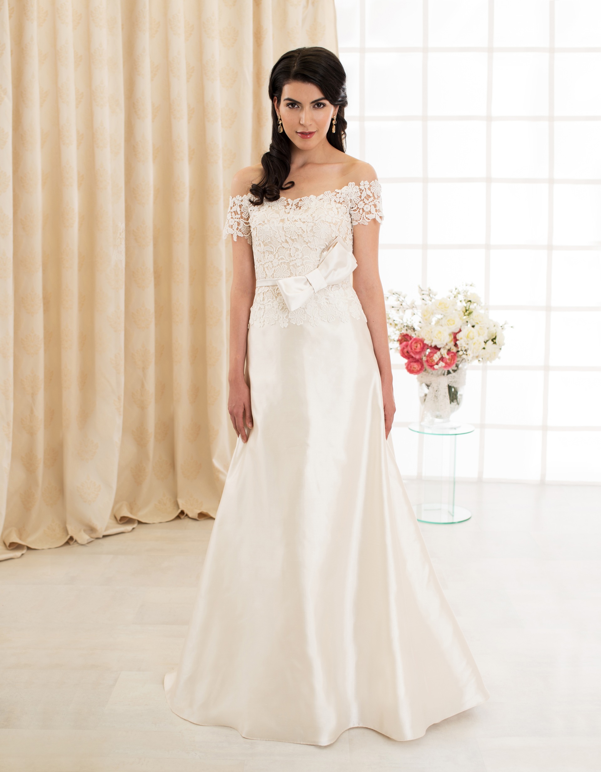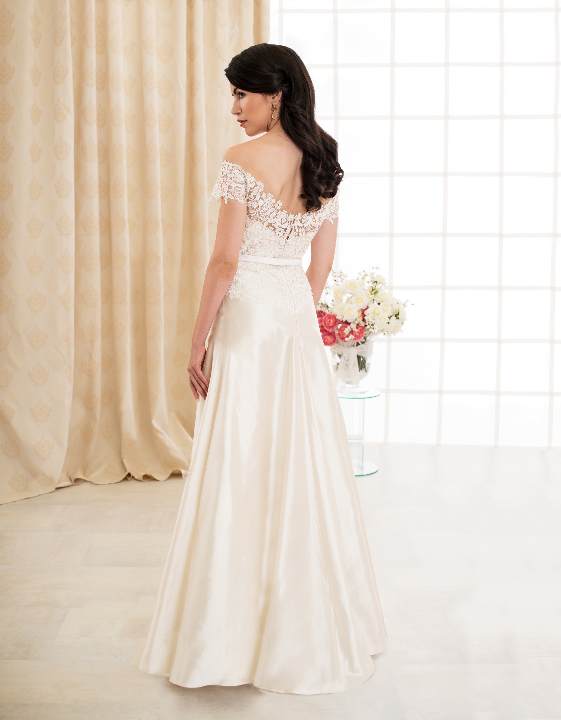Elegantes Brautkleid aus edel glänzender Seide mit einem Rock in schmaler A-Linie. Die Makramé Spitze auf der Korsage geht über in einen femininen Carmen-Ausschnitt, abgerundet wird die Kreation durch ein bezauberndes Schleifendetail in der Taille.