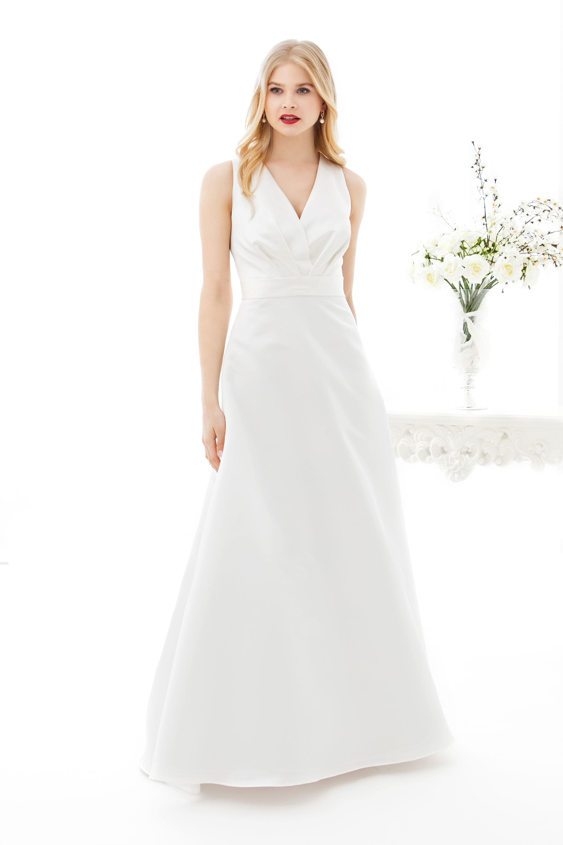 Modernes Brautkleid in A-Linie mit Trägern und Drapierungen im Oberteil. Gefertigt aus edlem Satin.