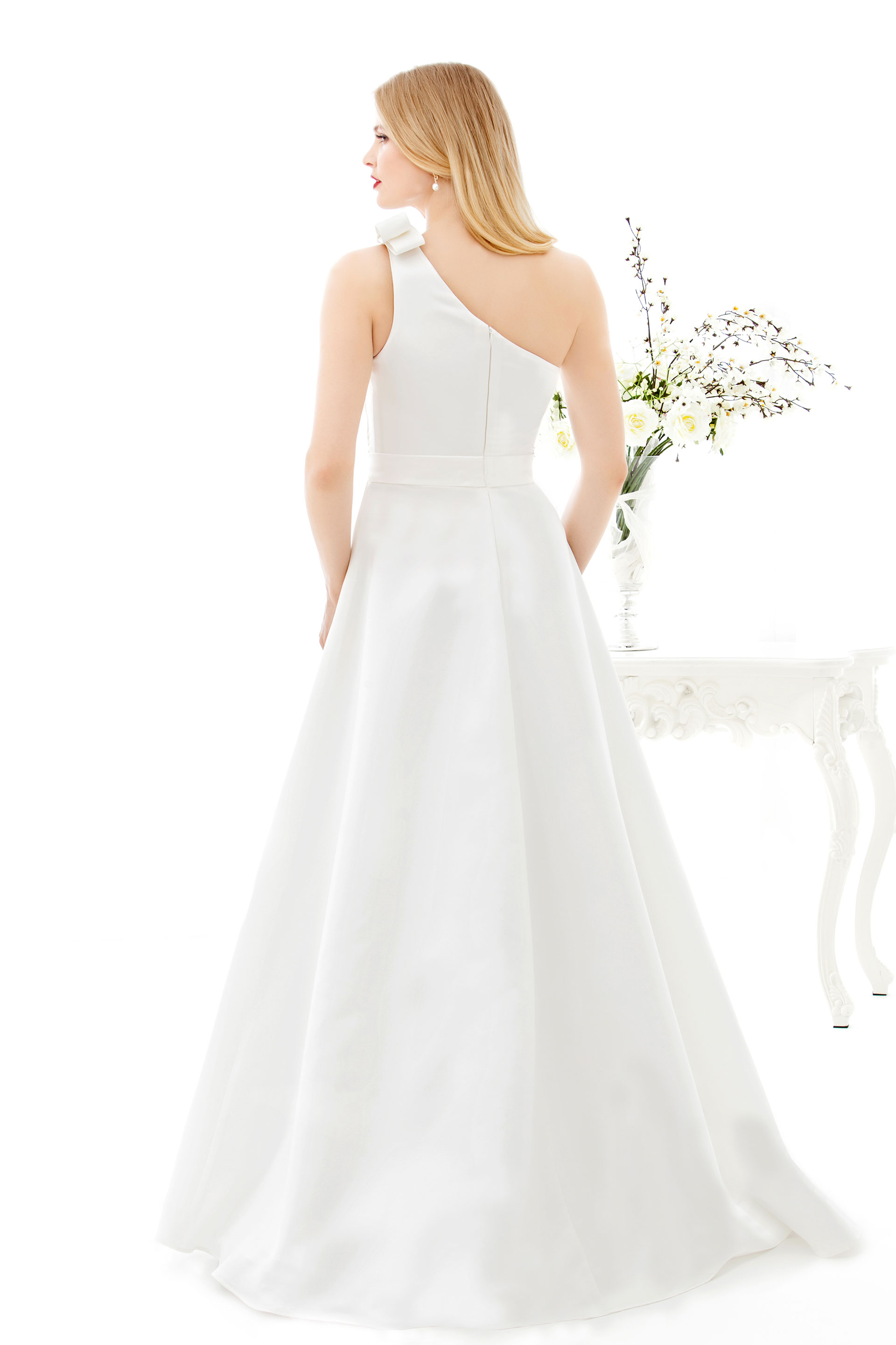 Brautkleid aus Satin in A-Linie mit Faltendetails im asymmetrischen Oberteil und einer großen Schleife auf der Schulter.
