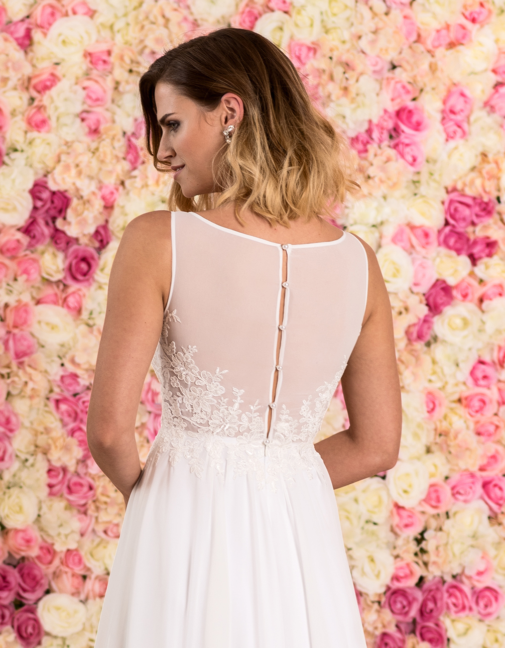 Dezentes Brautkleid aus Chiffon mit U-Boot Ausschnitt und drapiertem Faltenrock. Aufwendige Spitzen Applikationen im Corsagenbereich und eine dezente Knopfleiste im Rücken komplettieren dieses elegante Hochzeitskleid.