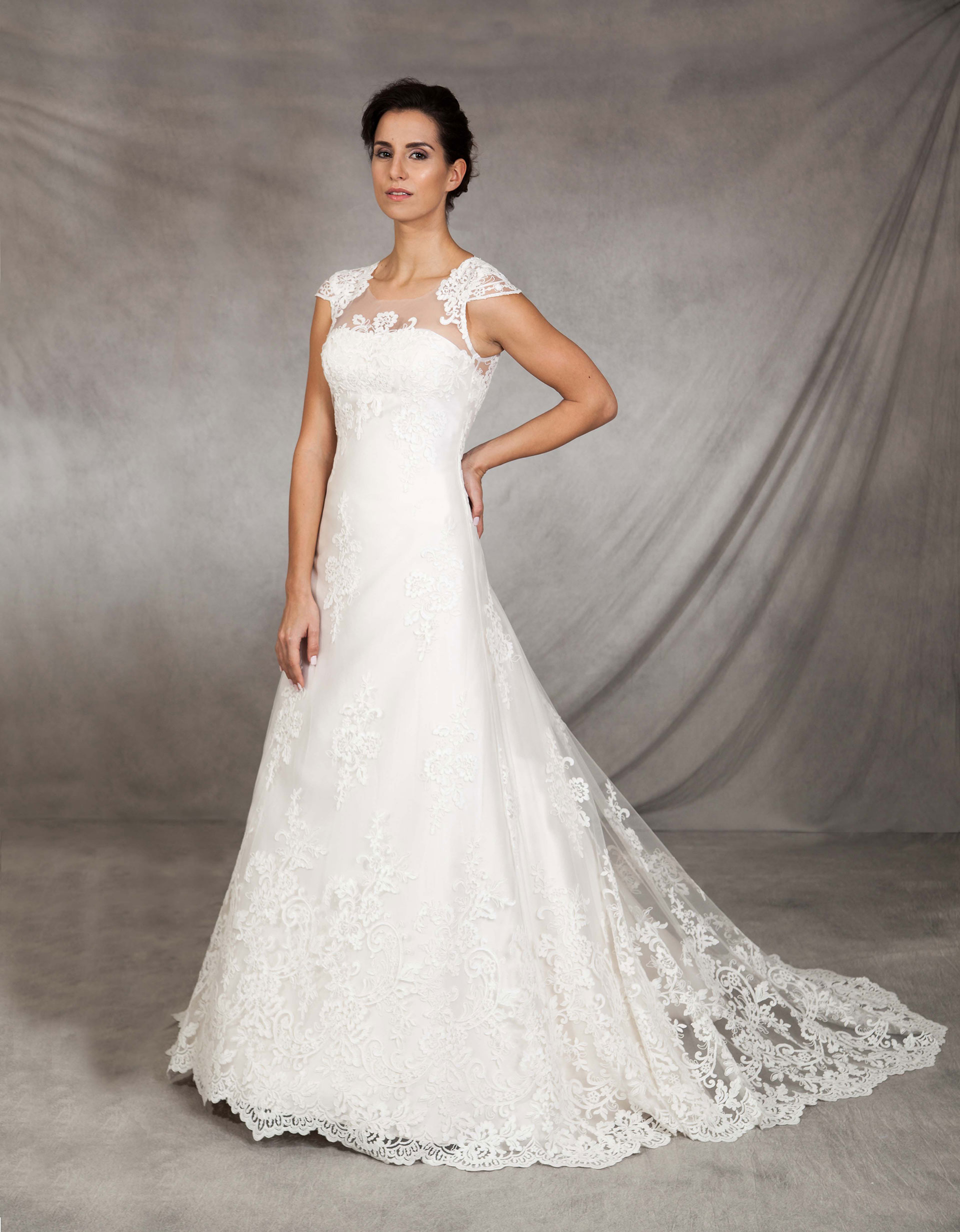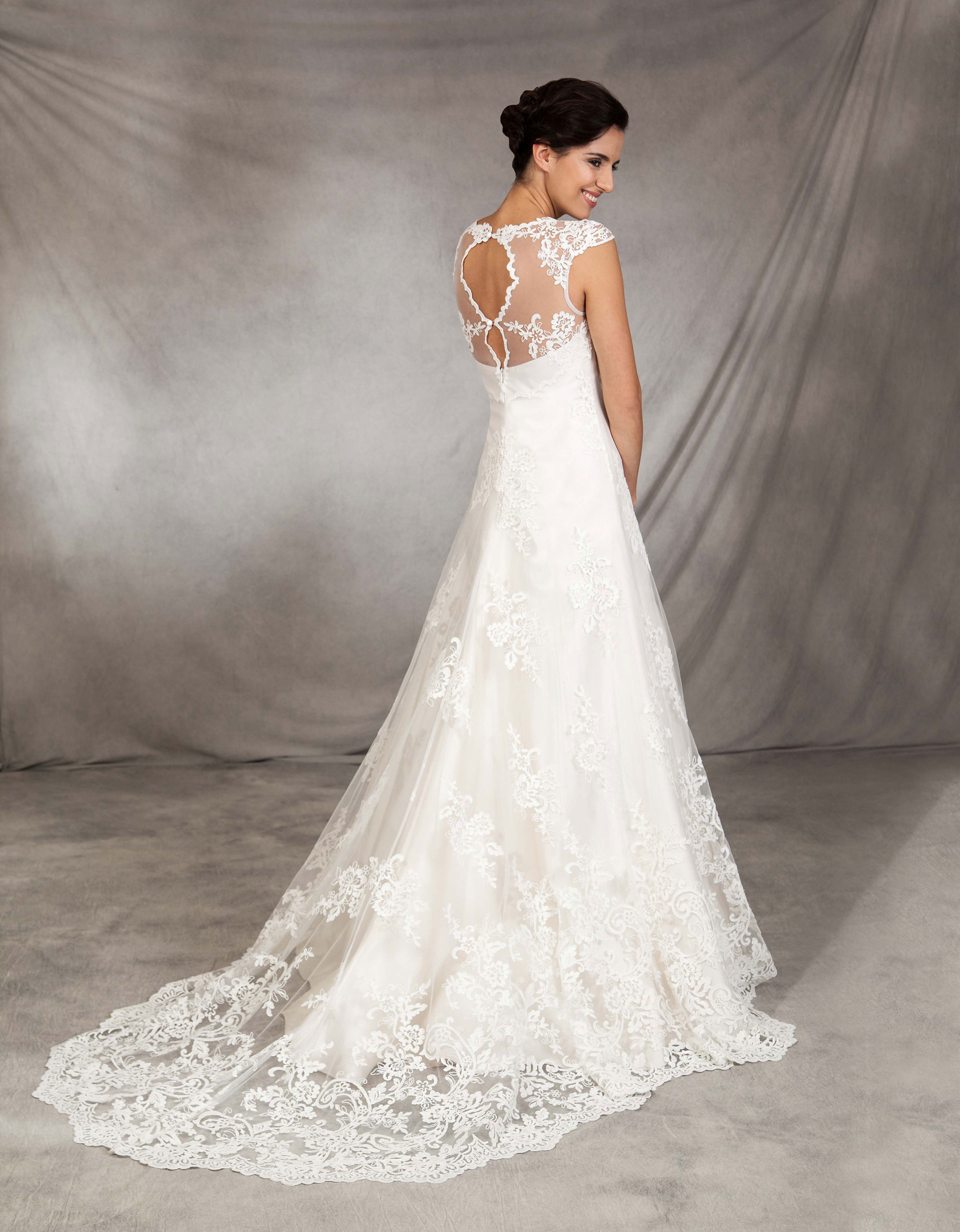 Hinreißendes Prinzessinnen ähn- liches Brautkleid in A-Linie. Gefertigt aus wertvoller Mikado Seide und Spitze aus zartem Tüll mit großflächigen Stickereien.