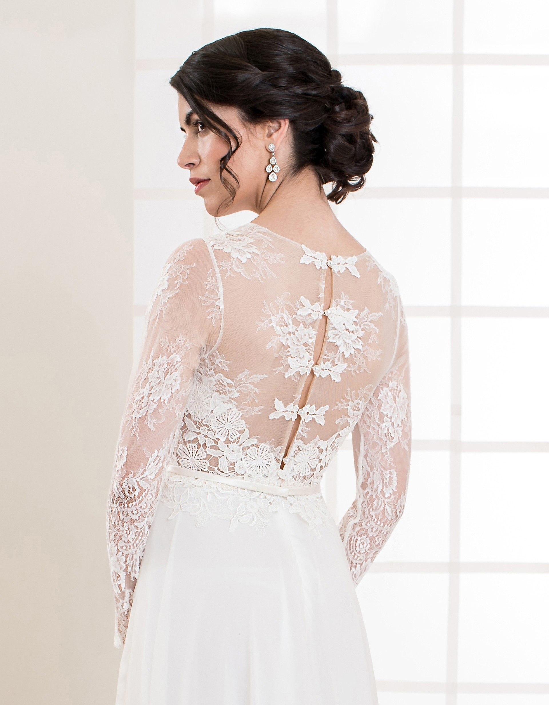 Romantisches, bodenlanges Brautkleid mit einem fließenden Rock aus Seiden-Chiffon und langen Ärmeln aus zart tranparenter Chantilly Spitze. Besonderer Hingucker sind die Applikationen aus Macramé Spitze, sowie der raffinierte Rückenverschluss mit Perlenknöpfen.