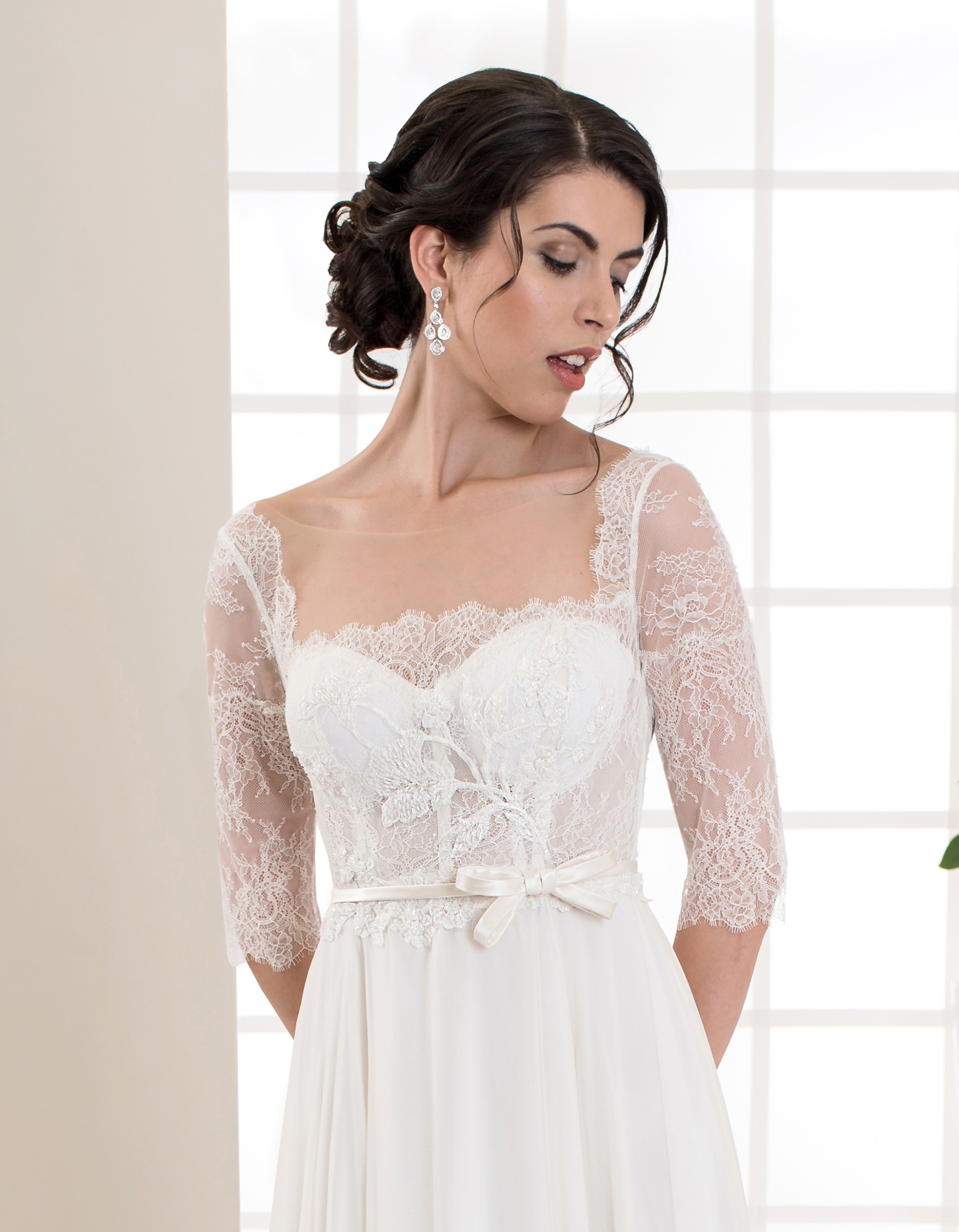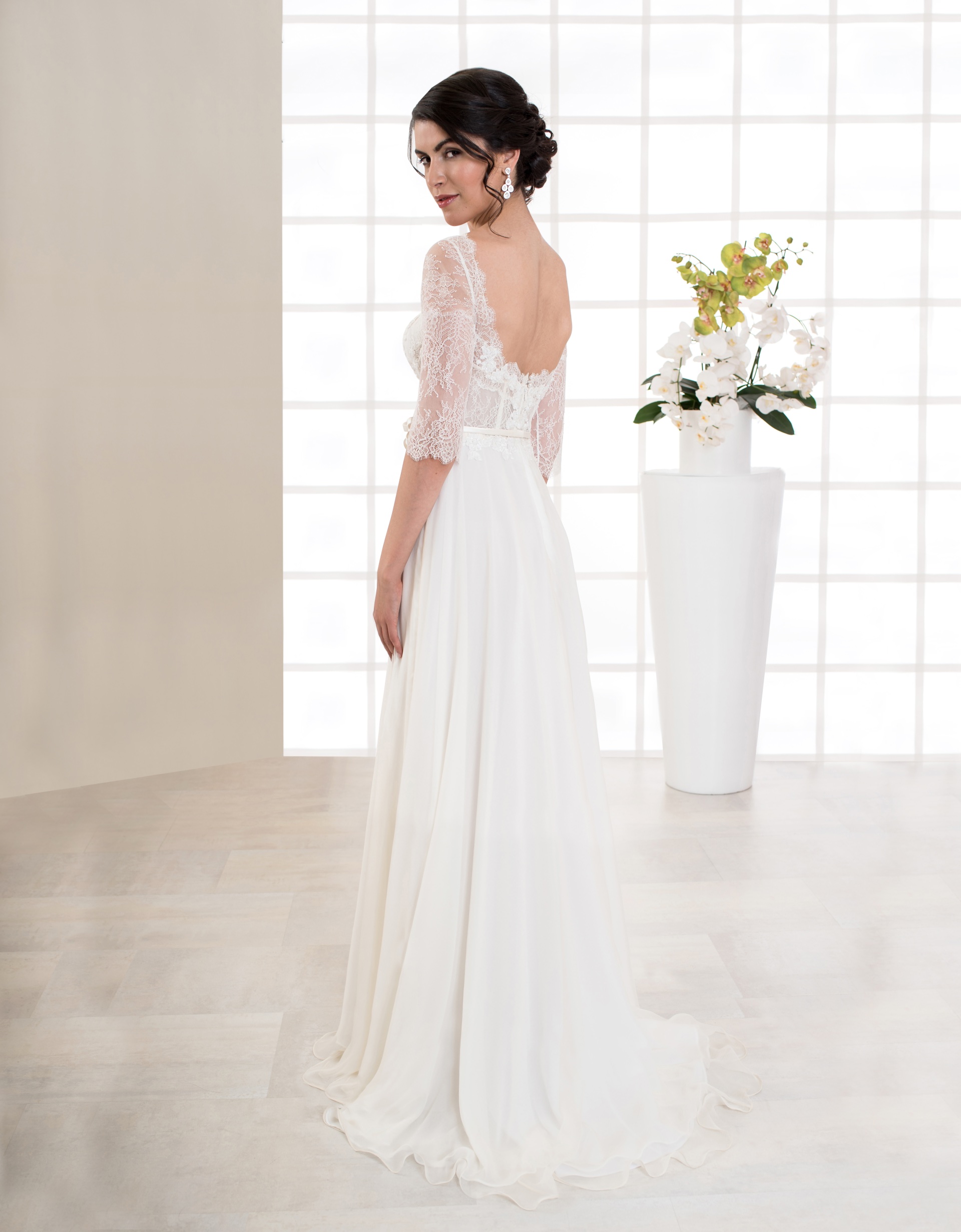 Bezauberndes, bodenlanges Brautkleid mit einem Rock aus weich fließendem Seiden-Chiffon. Das zarte Oberteil aus Chantilly-Spitze mit Transparenz-Effekt und langen Ärmeln bildet einen romantischen Kontrast zum schlichten Rock. Besonderes Highlight sind die handgenähten Applikationen mit Perlen.