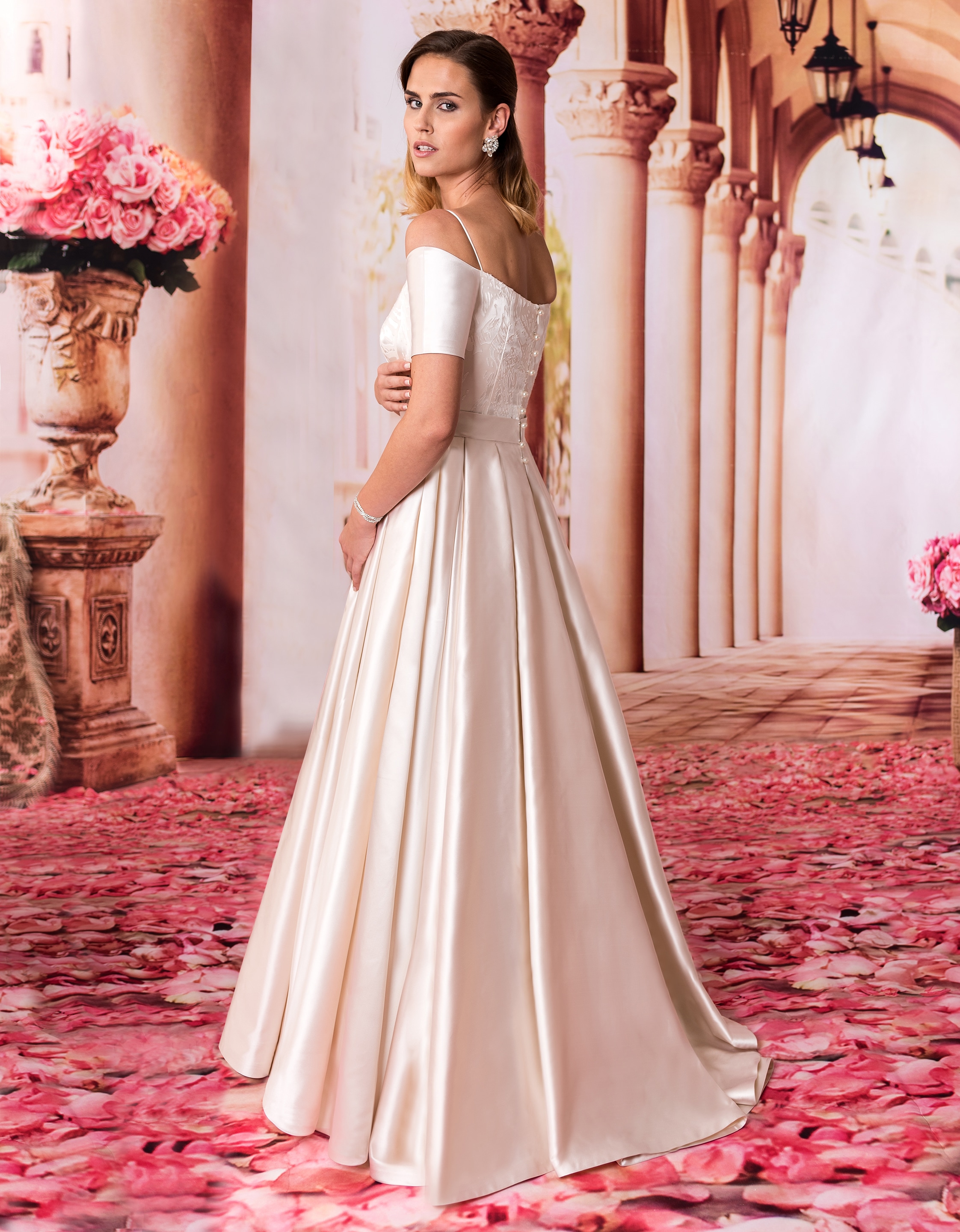 Bodenlanges, edles Brautkleid mit Taschen aus hochwertigem Seidenstoff und Satinoptik. Das stilvolle Oberteil mit kurzen Ärmeln wird durch filigrane Träger komplettiert. Raffiniertes Detail ist die Perlenknopfleiste am Rücken.