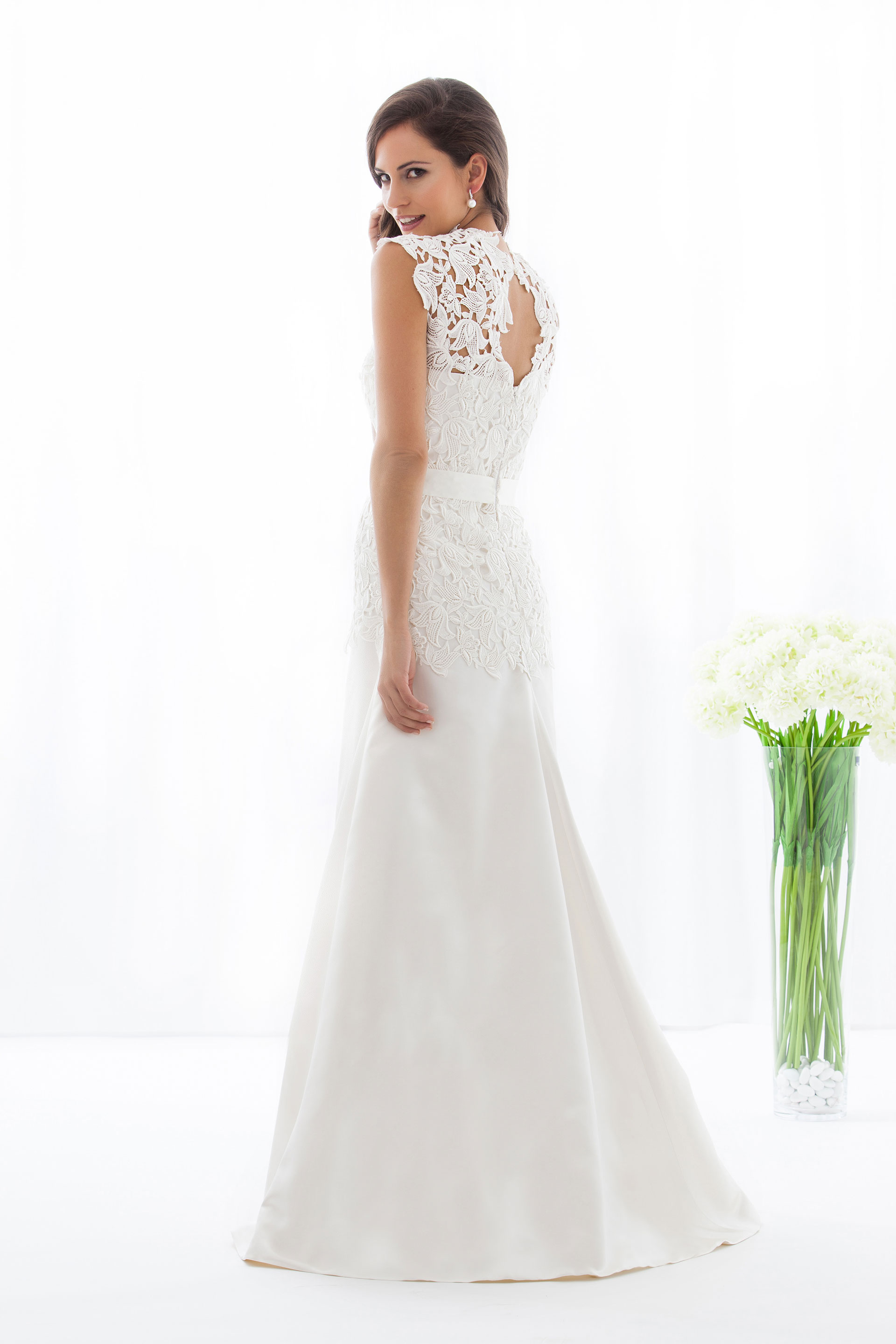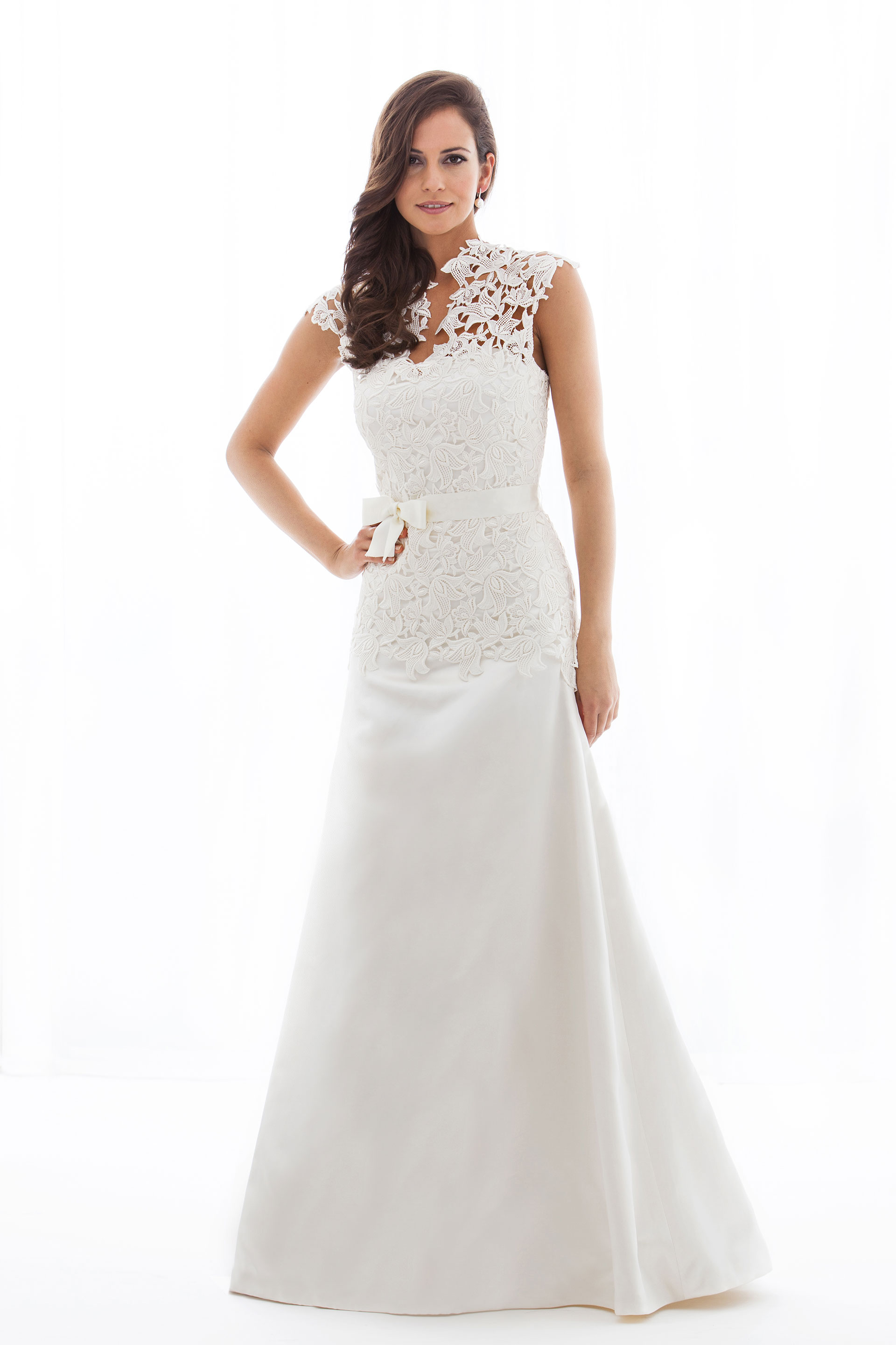 Brautkleid in schmaler A-Linie aus edlem Seidensatin mit einem Oberteil aus Macramé-Spitze und außergewöhnlicher Ausschnittgestaltung.
