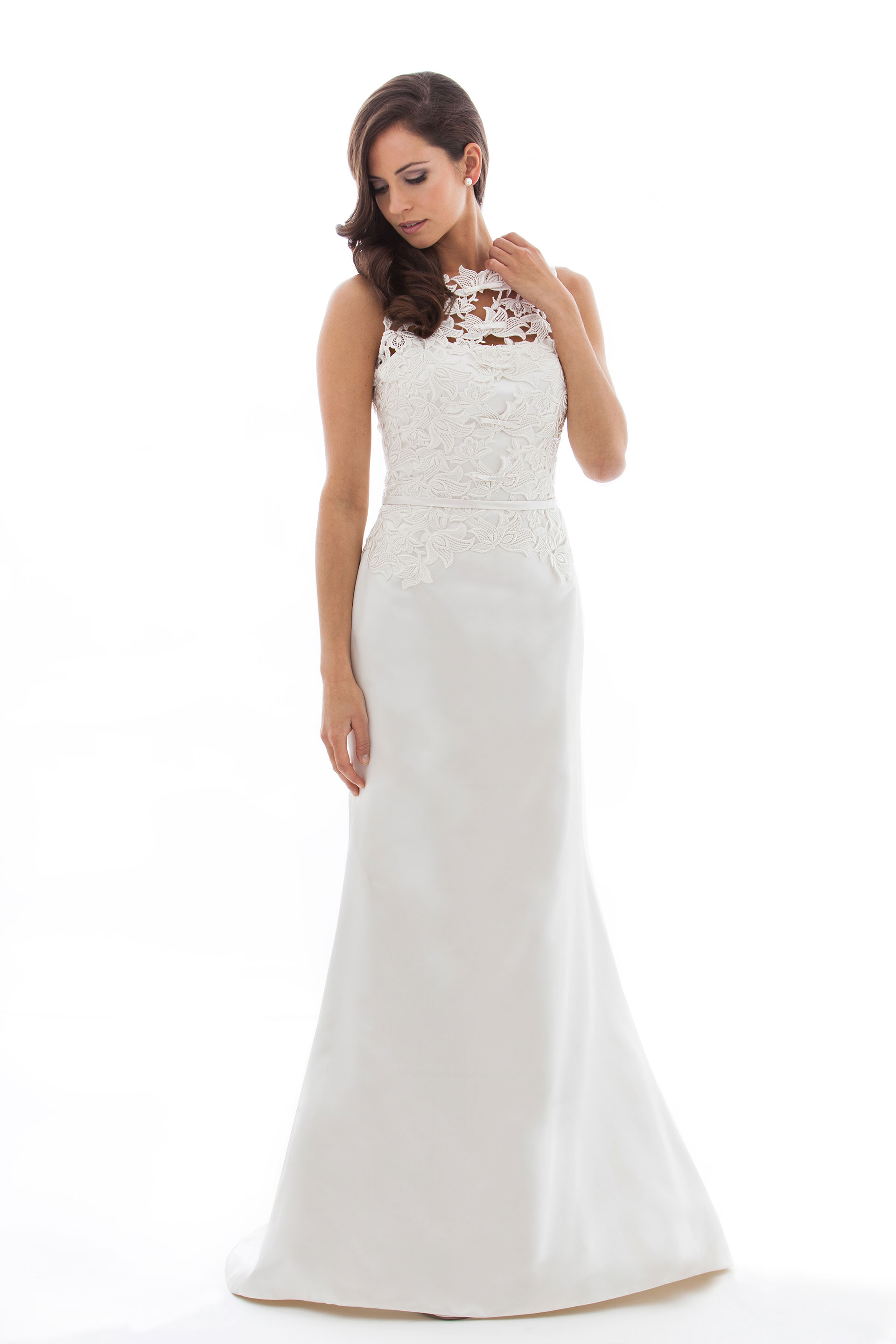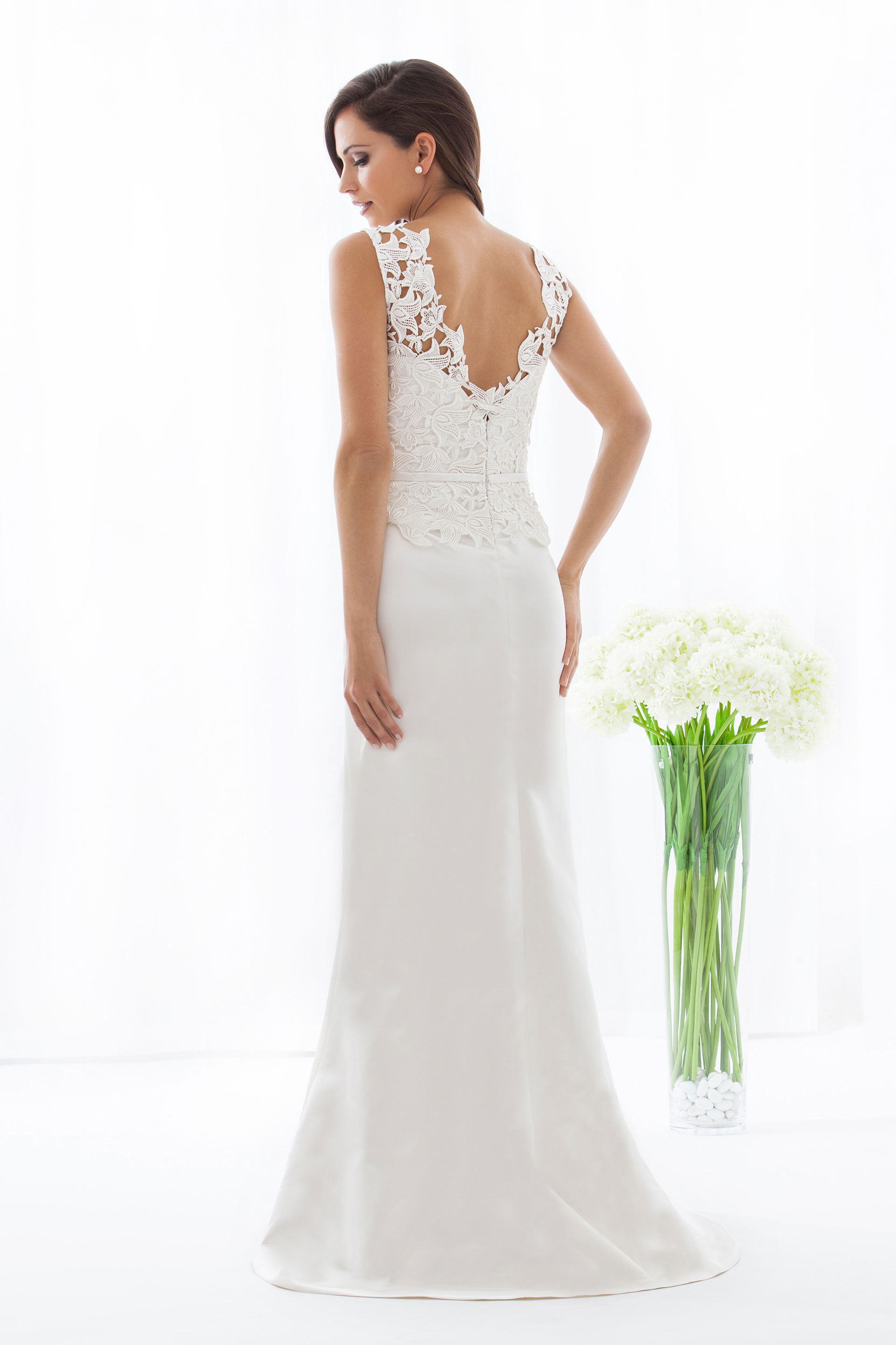 Edles Seiden-Brautkleid in dezenter Meerjungfrau-Silhouette mit einem Spitzen-Top aus Baumwolle. Verspielte Schleifendetails vorne und V-Ausschnitt im Rücken.