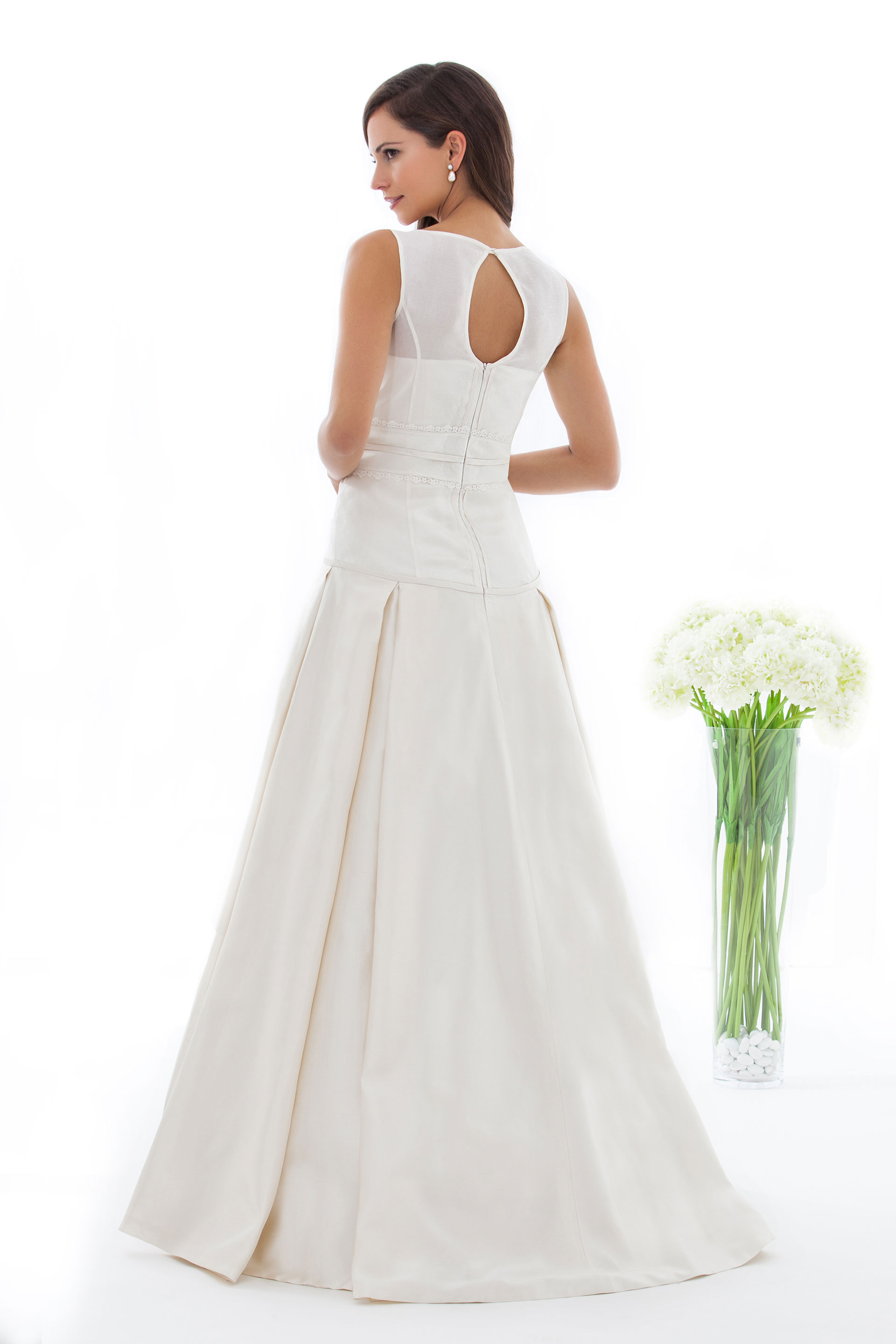 Brautkleid in A-Linie mit weichen Falten ab den Hüften. Oberteil aus zart transparentem Seiden-Jaquard mit Tropenausschnitt vorne und im Rücken.