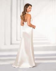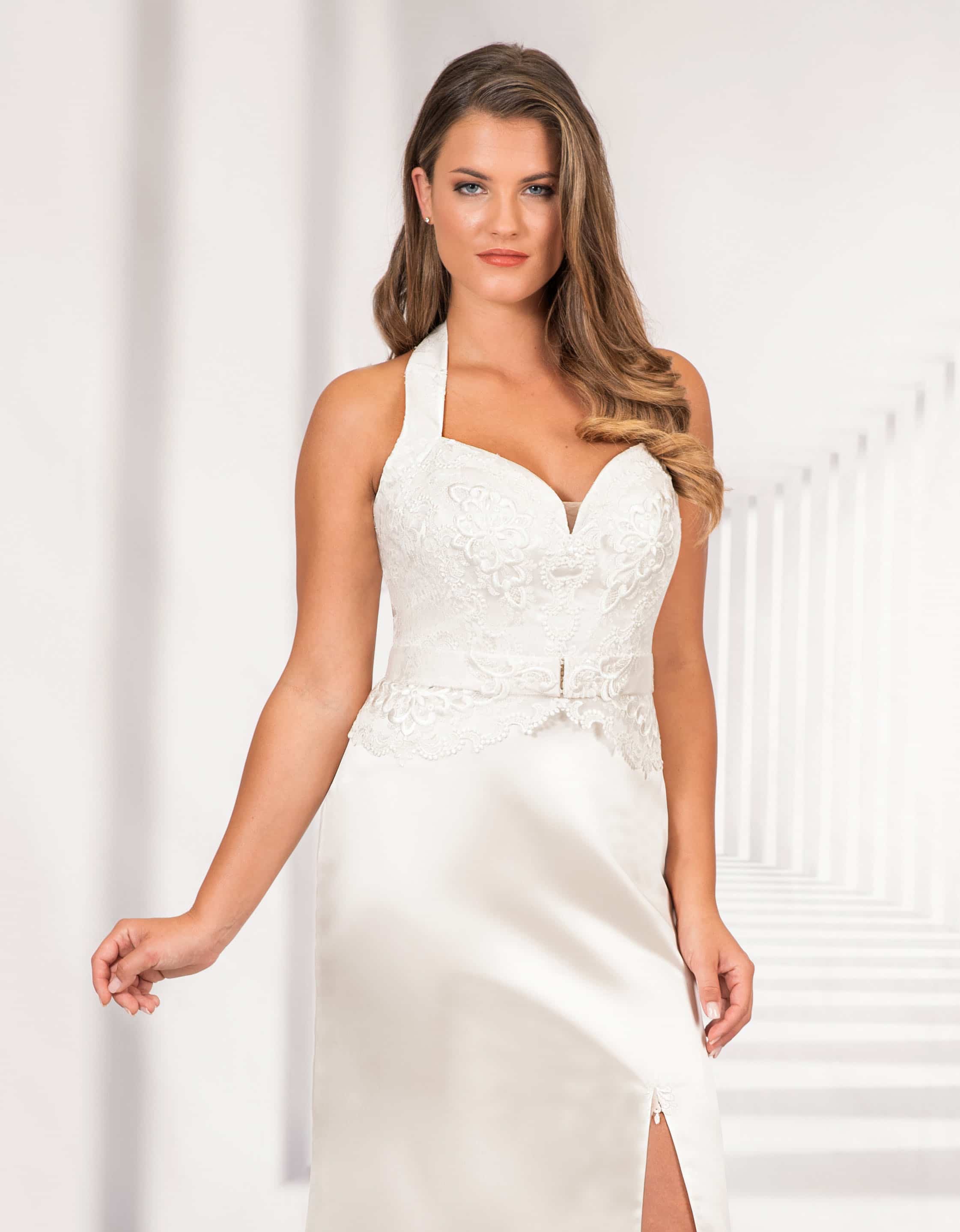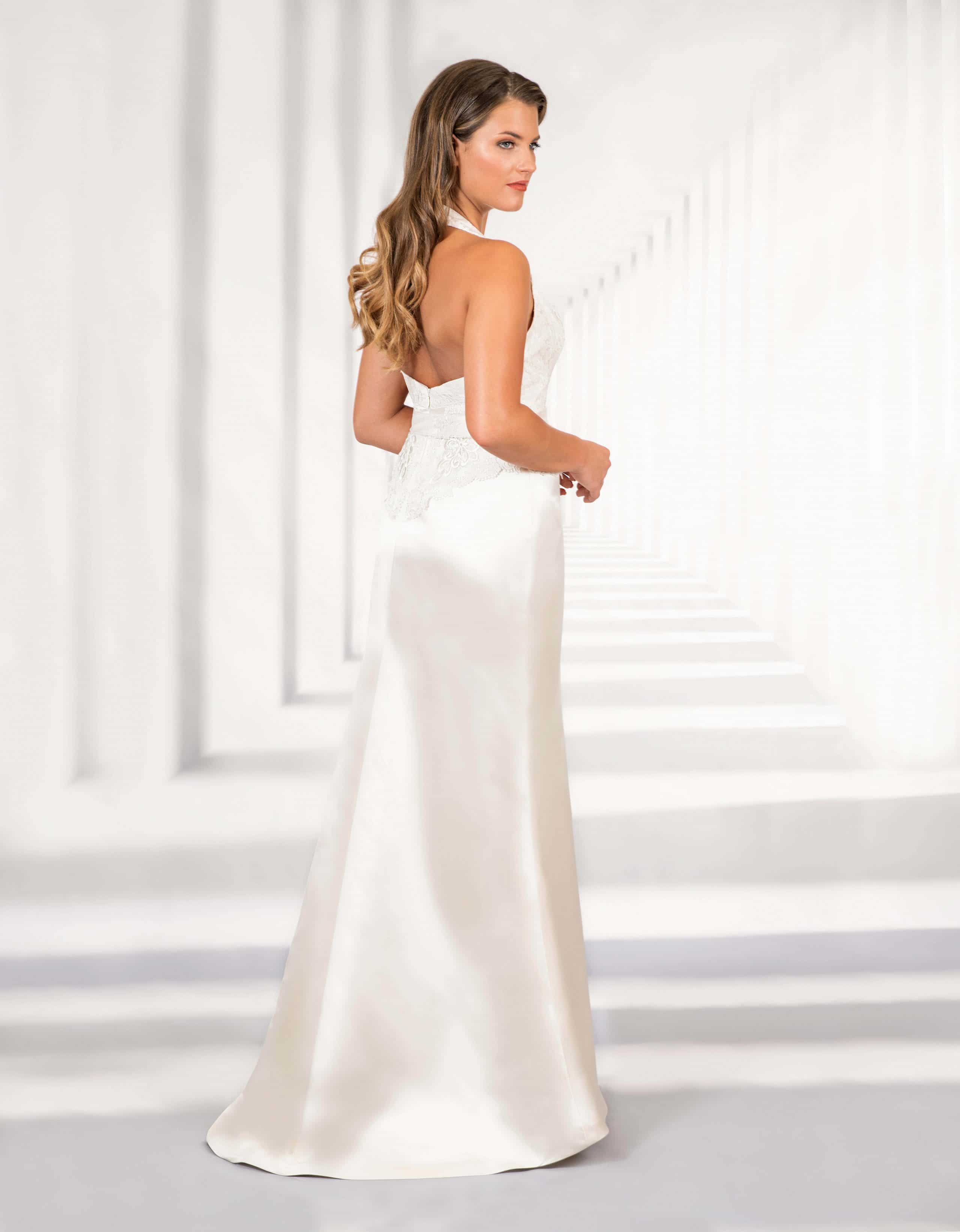 Feminines Brautkleid im Meerjungfrau Schnitt mit verführerischem Schlitz aus Seiden Satin. Das sinnliche Oberteil mit Neckholder ist mit Chantilly Spitze und einzelnen Motiven aus Makramee Spitze mit Pailletten verziert und sorgt für ein atemberaubendes Dekolletee.