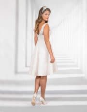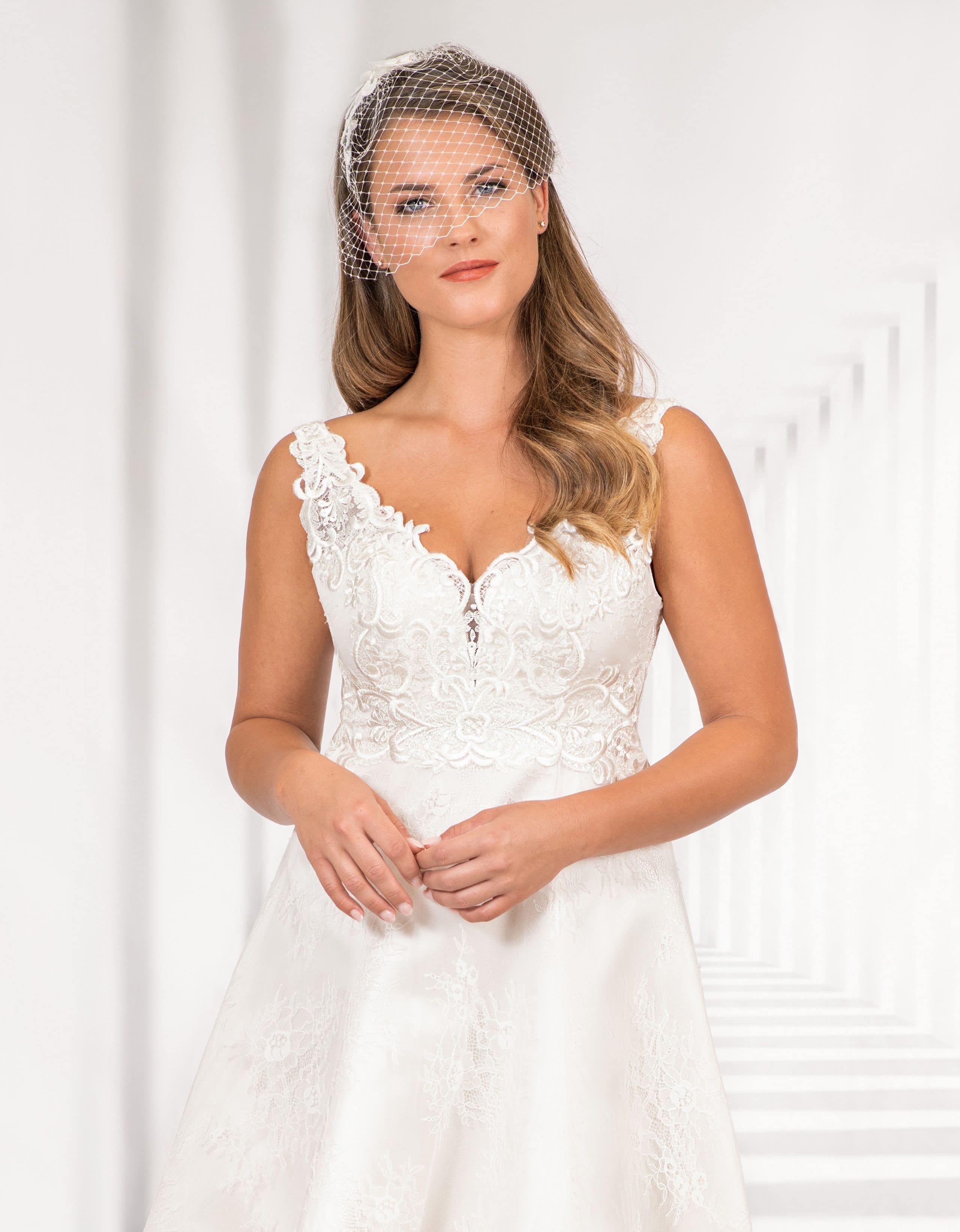 Knielanges Standesamtkleid in A-Linie aus Seiten Satin, das komplett mit zarter Chantilly Spitze verarbeitet ist. Das Oberteil mit Trägern hat einen atemberaubenden V-Ausschnitt, der im Brustbereich mit filigranen Motiven aus Pailletten Spitze verziert ist. Zu diesem bezaubernden Brautkleid lässt sich unser romantischer Kopfschmuck perfekt kombinieren.