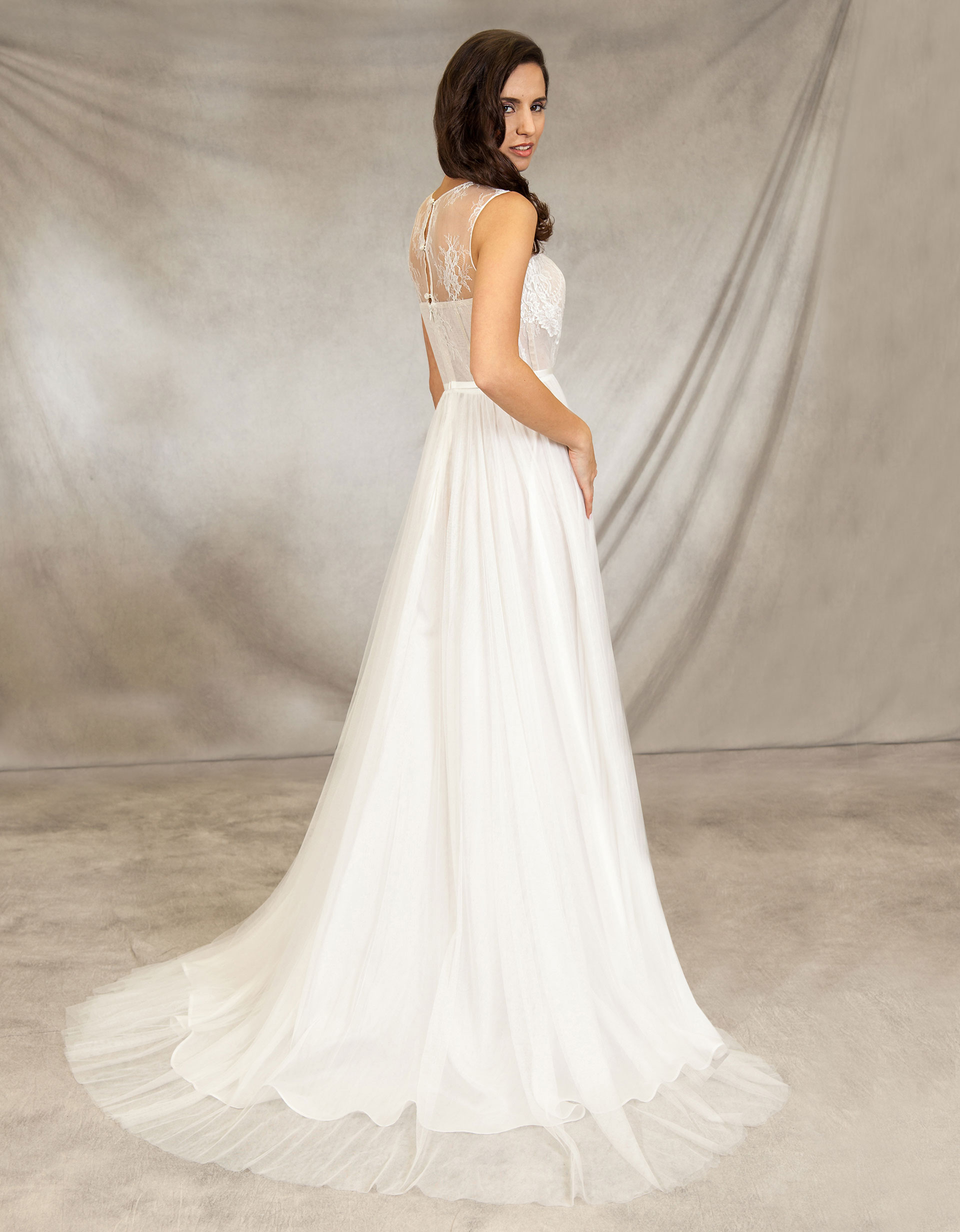 Sommerliches Brautkleid in A-Linie mit einem fließenden Tüll Rock und einem Oberteil aus Spitze. Ein schmeichelndes Modell mit zarter Transparenz im Dekolleté, ergänzt durch modernen Metallschmuck am Gürtel.