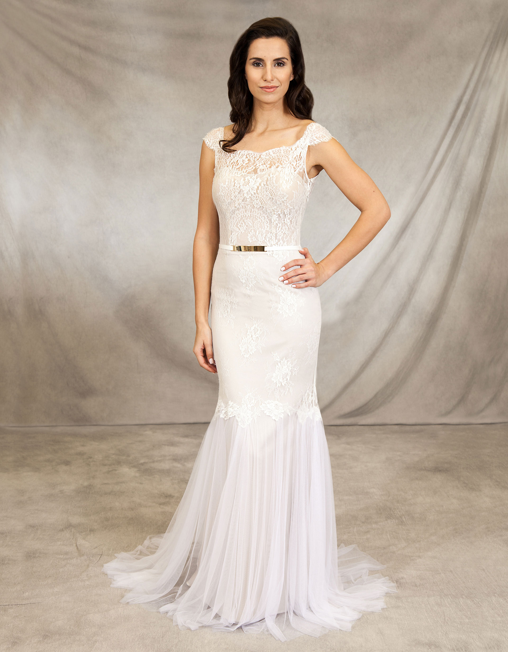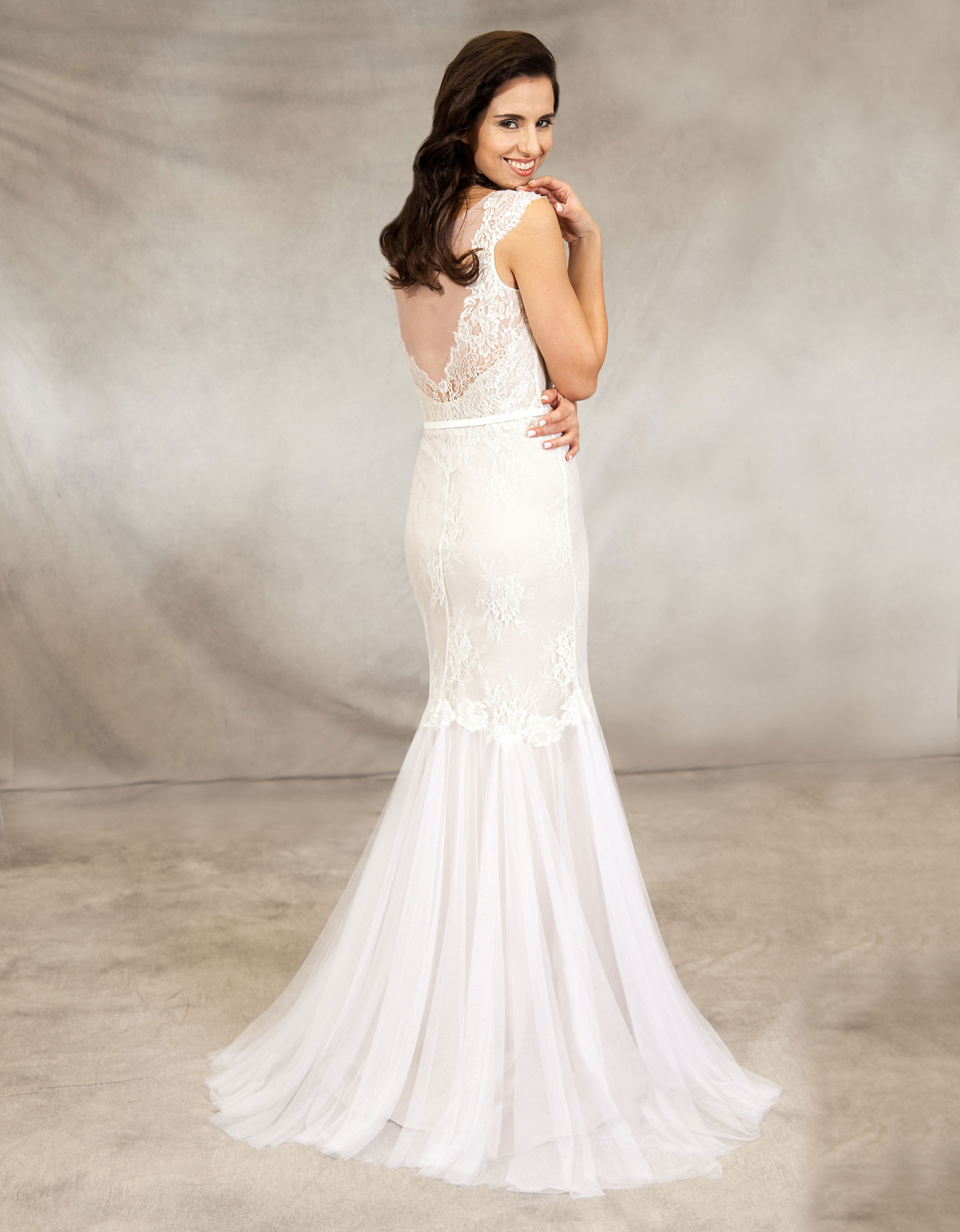 Atemberaubendes Brautkleid in Meerjungfrau-Silhouette aus Tüll und zarter Spitze auf angesagtem Nude-Ton. Die transparente Spitze umschmeichelt die Schultern der Braut, bevor sie sich im Rücken zu einem tiefen Ausschnitt in V-Form öffnet. Ein weiterer Blickfang ist der moderne Metallschmuck am Gürtel.