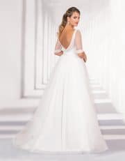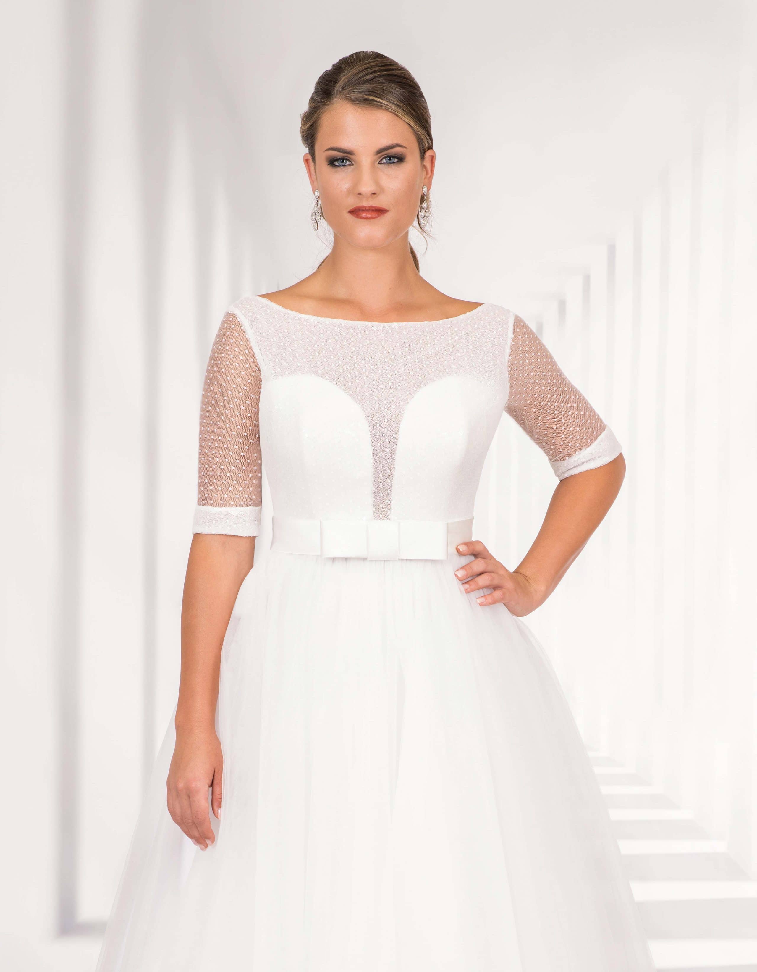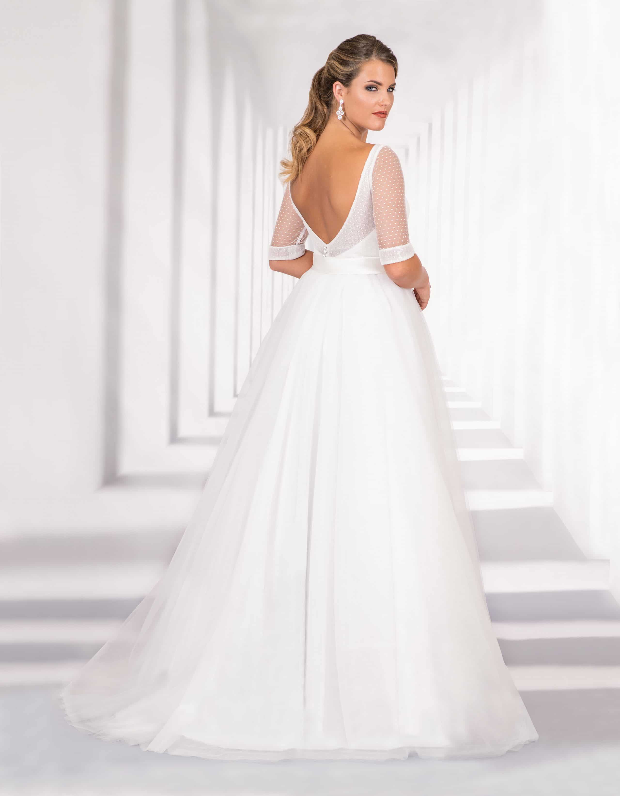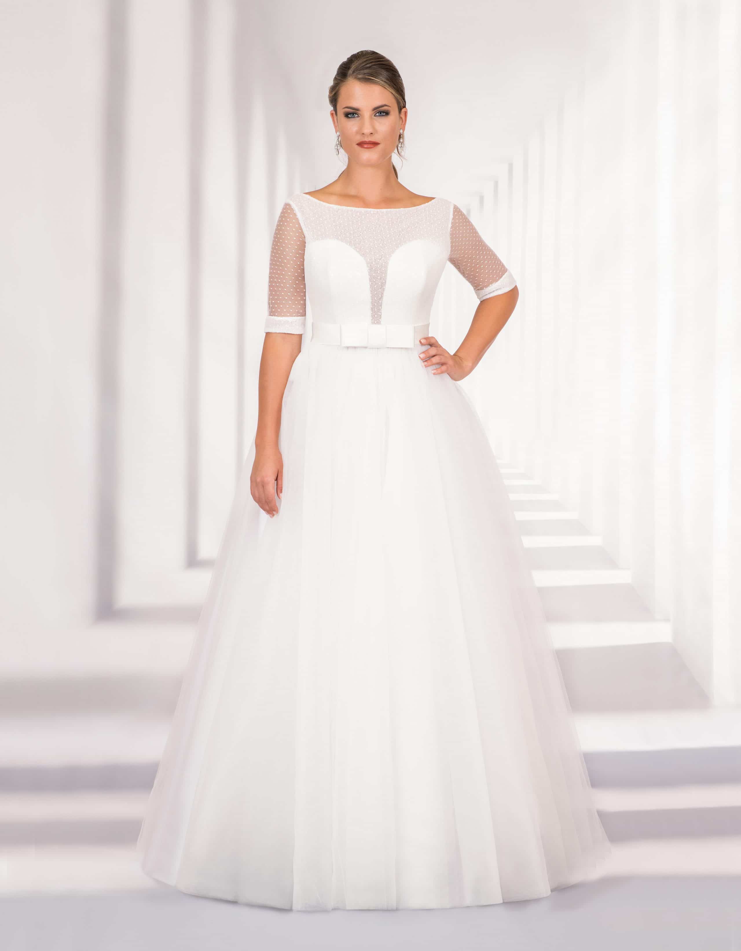 Romantisches Prinzessin Tüllkleid mit Schleppe in A-Linie, dessen märchenhafter Rock weiche Falten wirft. Das traumhafte Oberteil aus feinem Paillettentüll hat vorne einen zarten U-Boot Ausschnitt und beeindruckt durch einen tiefen V-Ausschnitt im Rücken. Halblange Ärmel aus transparentem Tüll und ein breiter Satin Gürtel mit stilvoller Schleife vervollkommnen die bezaubernde Kreation.