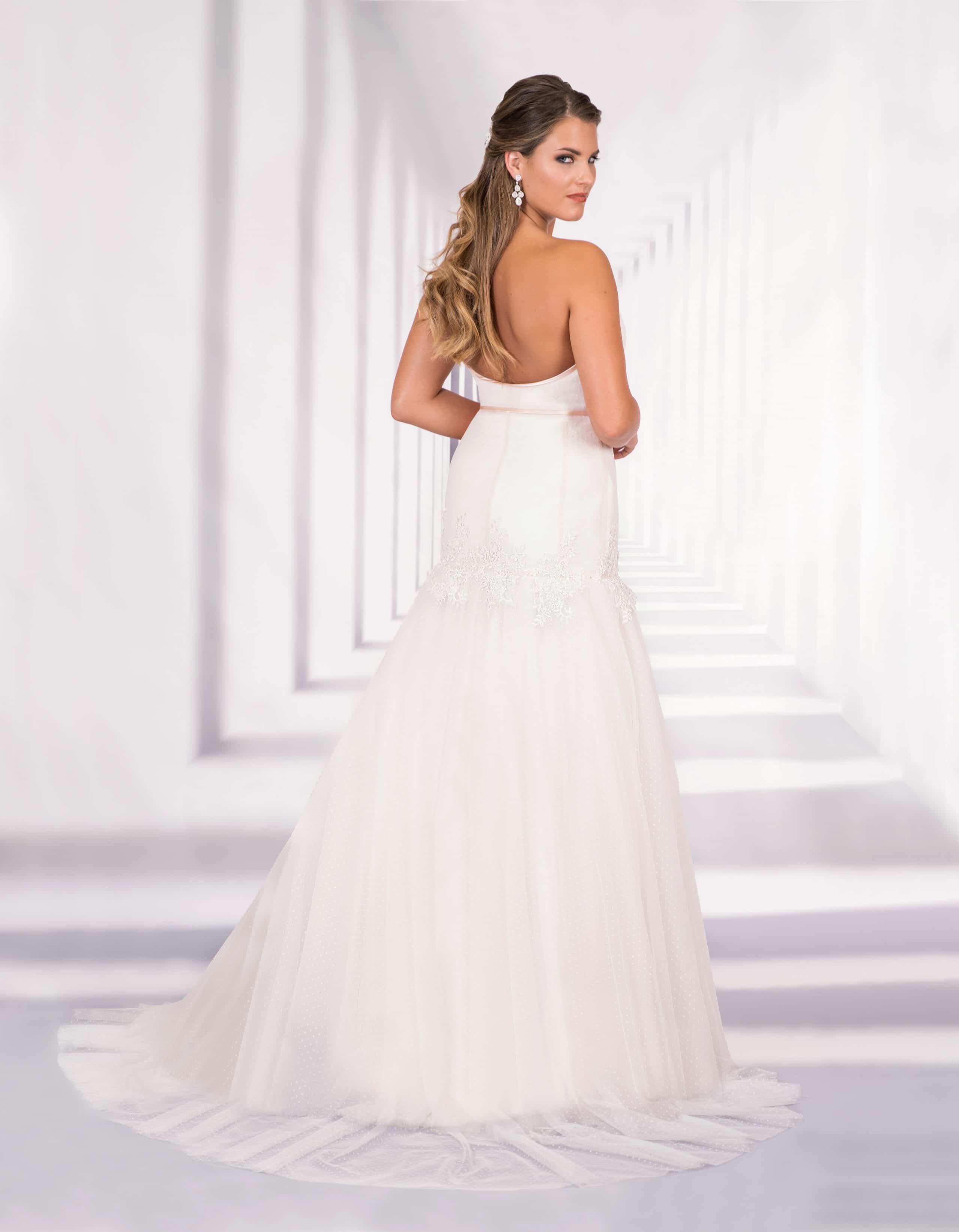 Elegantes Korsagenkleid mit traumhaften Tüllrock und romantischer Schleppe. Das Außergewöhnliche an dieser Kreation ist, dass sie bis zur Hüfte enganliegend ist, bevor der weit fallende Rock aus feinem gepunktetem Tüll beginnt. Das figurbetonte Oberteil fasziniert durch zarte Verzierungen aus Kordelspitze und edlen Einfassungen aus Satin. An kühlen Tagen lässt sich zu dieser Kreation ideal einer unserer traumhaften Bolero-Jacken aus Spitze kombinieren.
