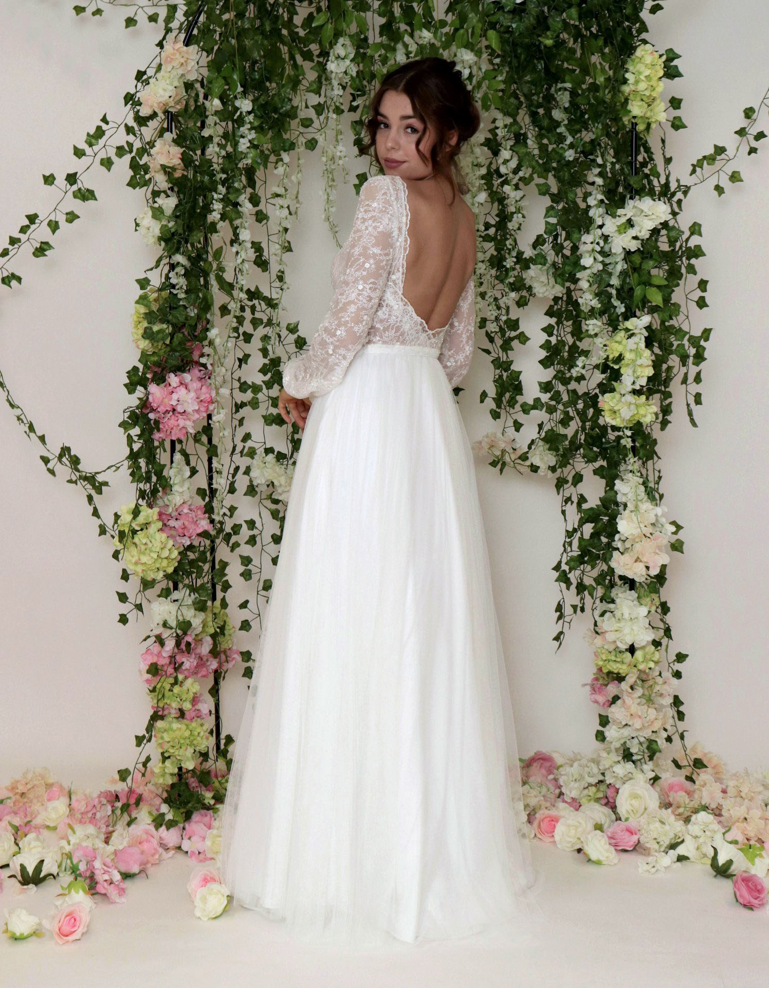 Hinreißendes Puffärmels Tüll Brautkleid in A-Linie aus Spitzen transparentem Oberteil mit kleinen 3D Blütenapplikationen und lässigem Softtüllrock.