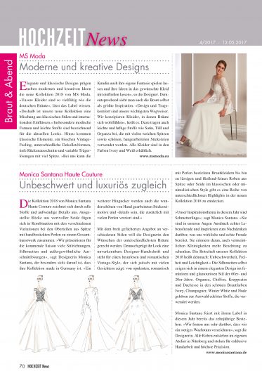 Mônica Santana Haute Couture stellt sich der Brautbranche ein Label vor, das zu 100 Prozent made in Germany ist: Alle Brautkleider und die komplette Abendmodenkollektion der Marke werden in Deutschland entworfen und produziert…
